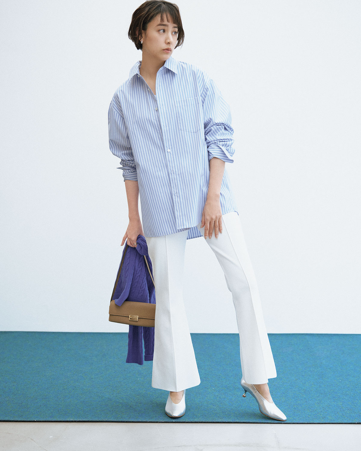 メンズライクなストライプシャツは、袖をまくってほんのり崩して着ることで、ほどよい抜け感を演出。センタープレス入りの白パンツを合わせれば、縦のラインが強調されてすらりとした印象に。パンプスで足元に艶を添えることでカジュアルになりすぎず、大人の上品さもキープできます。