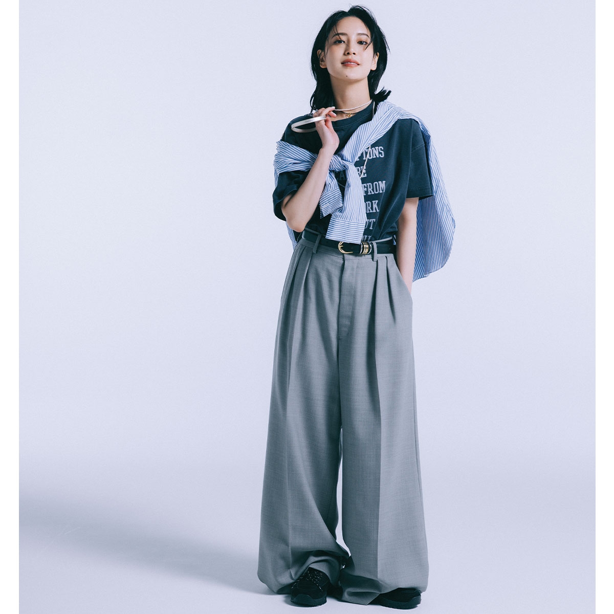グラフィックTとワイドパンツのゆるっとした組み合わせに、シャツを肩掛けしてさりげないひねりをプラス。メンズライクなアイテム同士でも、ウエストマークとシャツのアクセントで野暮ったさを回避。カジュアルのなかに少しきちんと感を足したい日にぴったり。