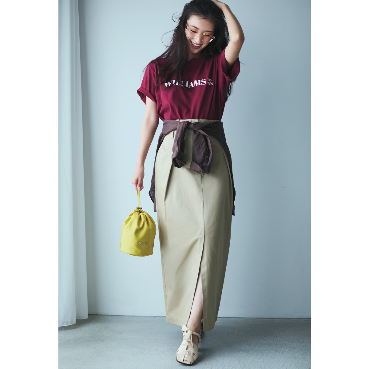 肌寒くなったら羽織れるシャツの利便性を活かした、腰巻きアレンジがポイント。Tシャツ×ストレートスカートのシンプルな組み合わせに立体感が加わり、バランスよく決まります。視線をウエストに引き寄せることで、縦長ラインをキープしながらスタイルアップも狙える着こなしに。