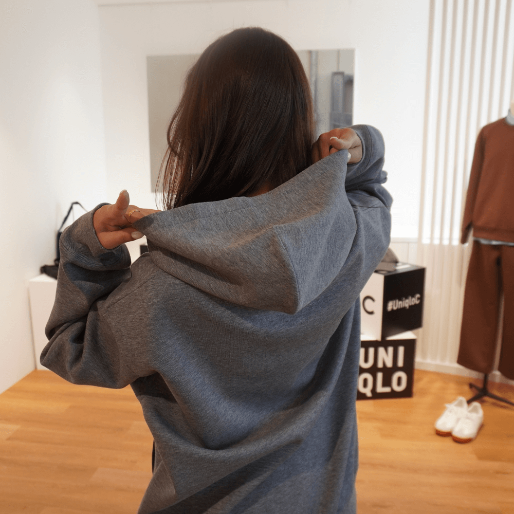 立体的できれいな形状のフードで、ヒップが隠れる丈感が可愛い。モデルは[05 GRAY]を着用。