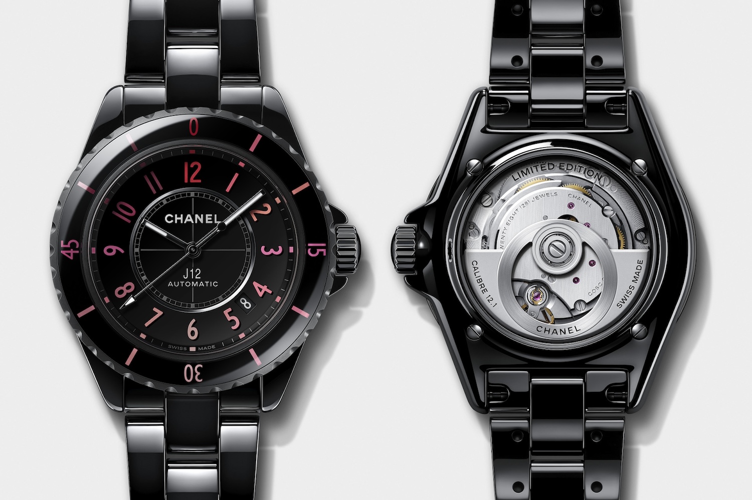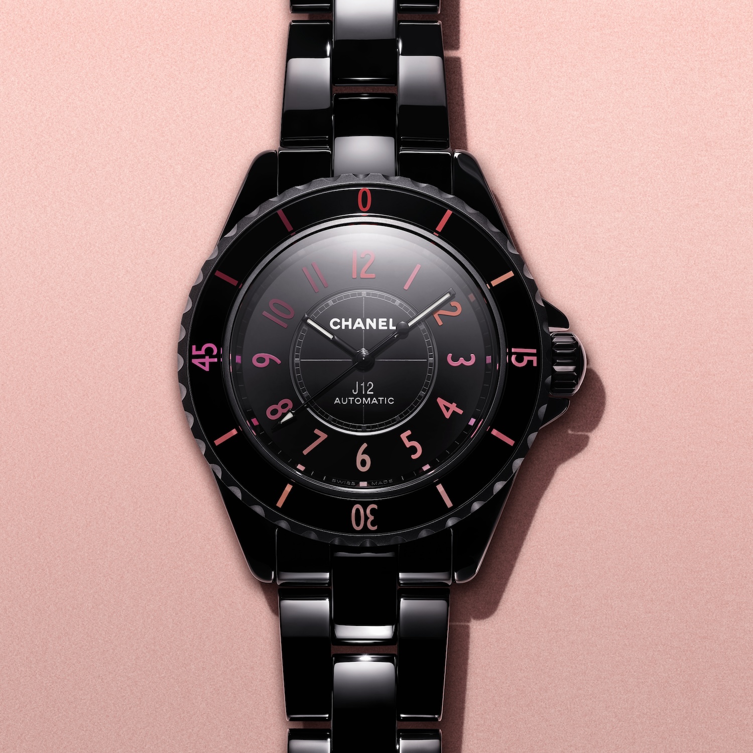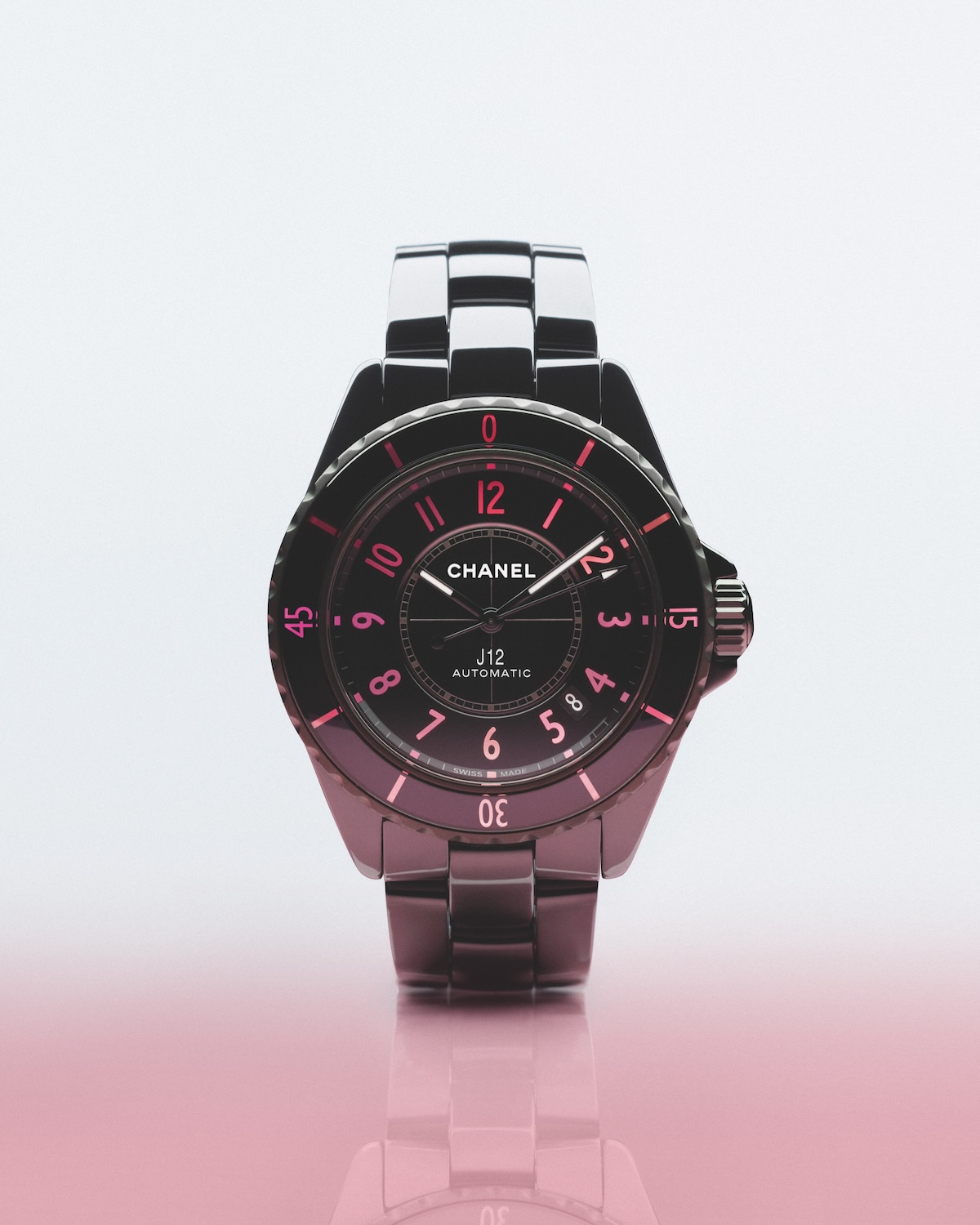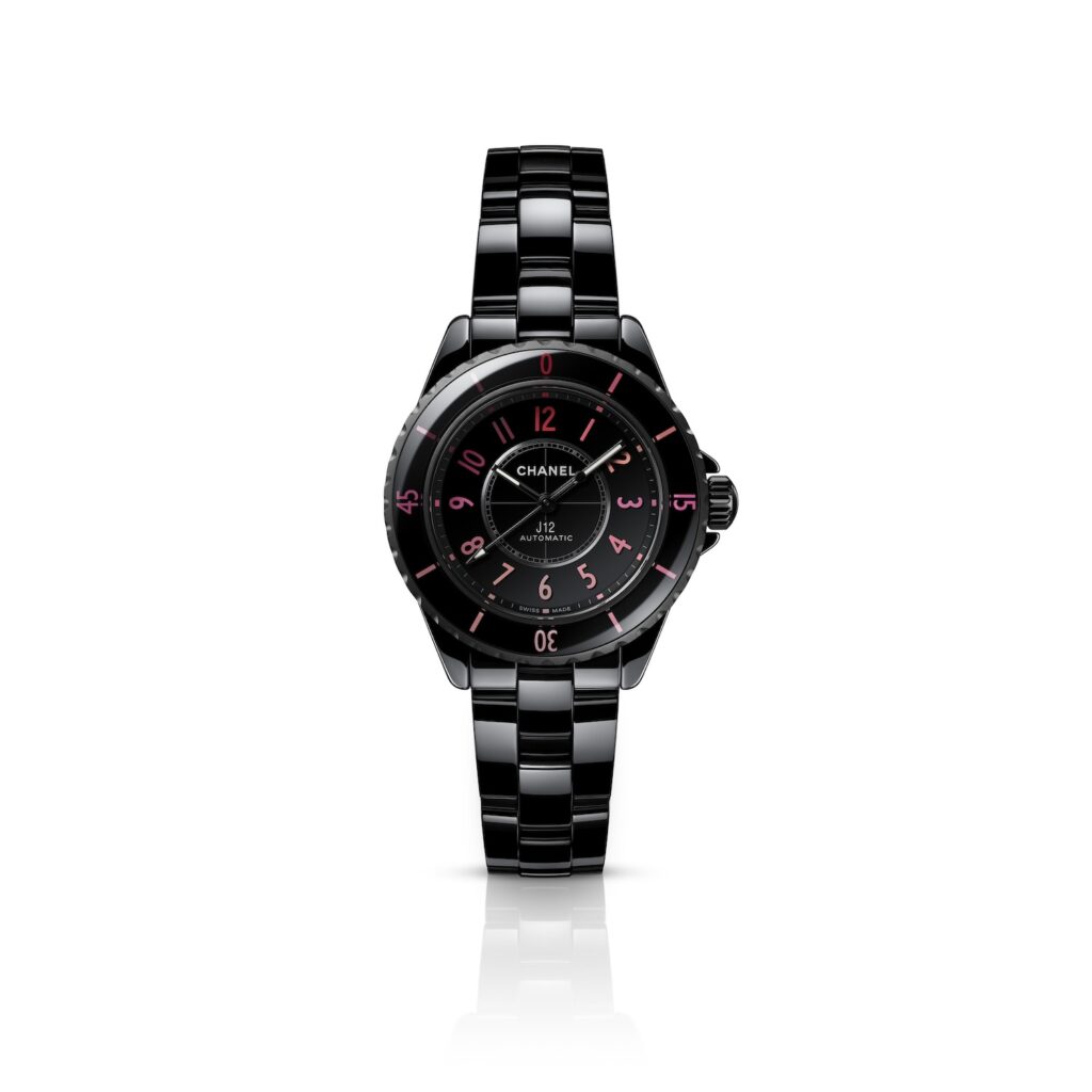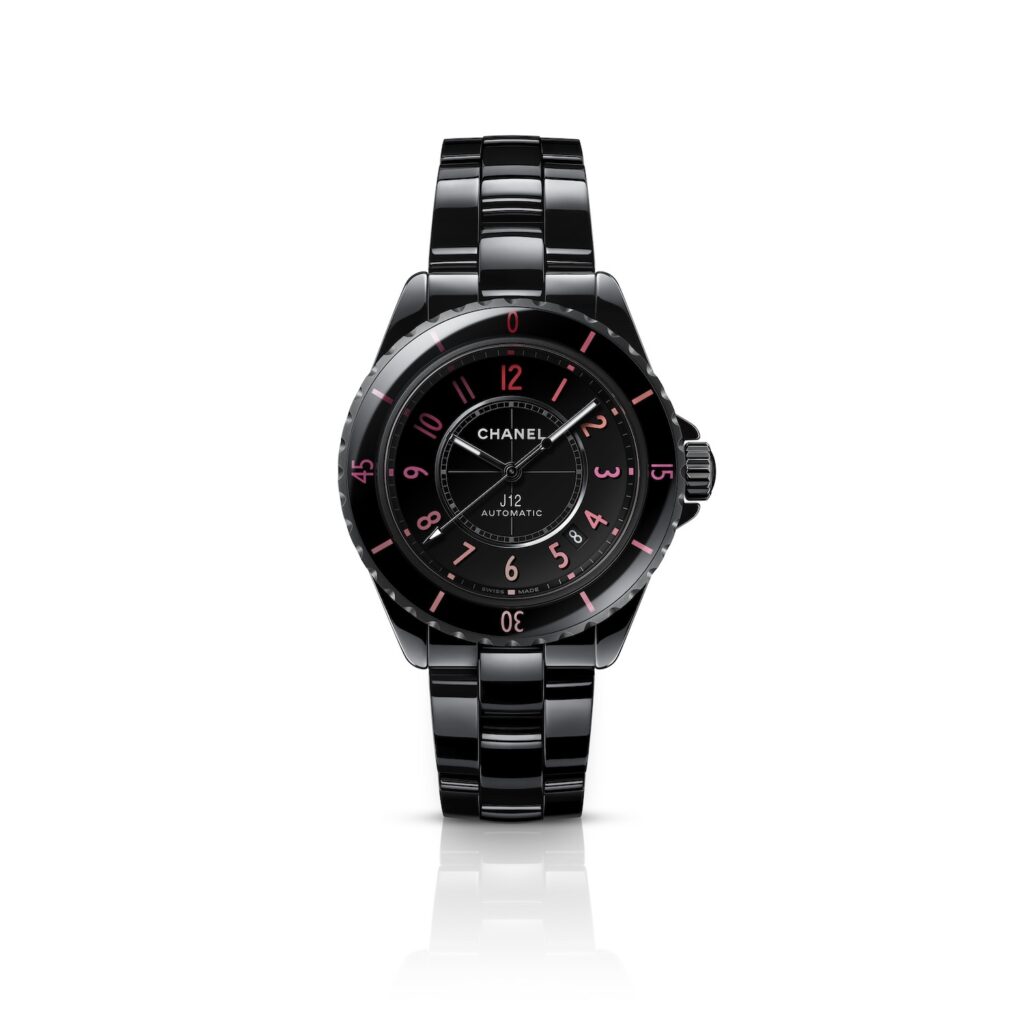 単色表現のピンクとレッドがインデックスとベゼルを彩る「J12 BLUSH」。セラミックの深いブラックと、ベゼルやダイヤルのインデックスのカラーグラデーションがコントラストを成し、無比のエレガンスと強さを放ちます。38mmサイズの「J12 BLUSH キャリバー 12.1」と、33mmの「J12 BLUSH キャリバー 12.2」の展開。