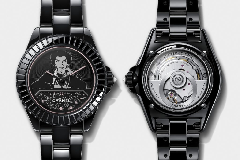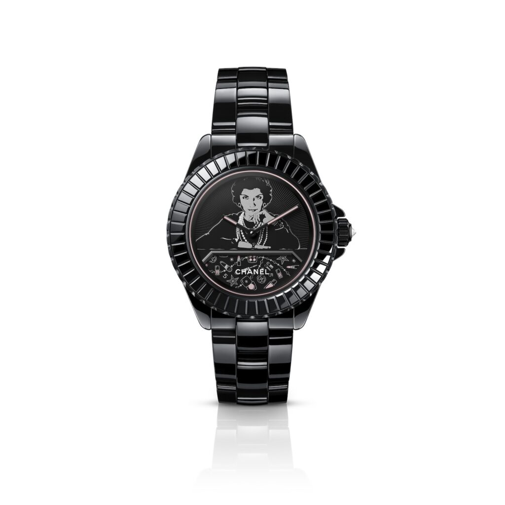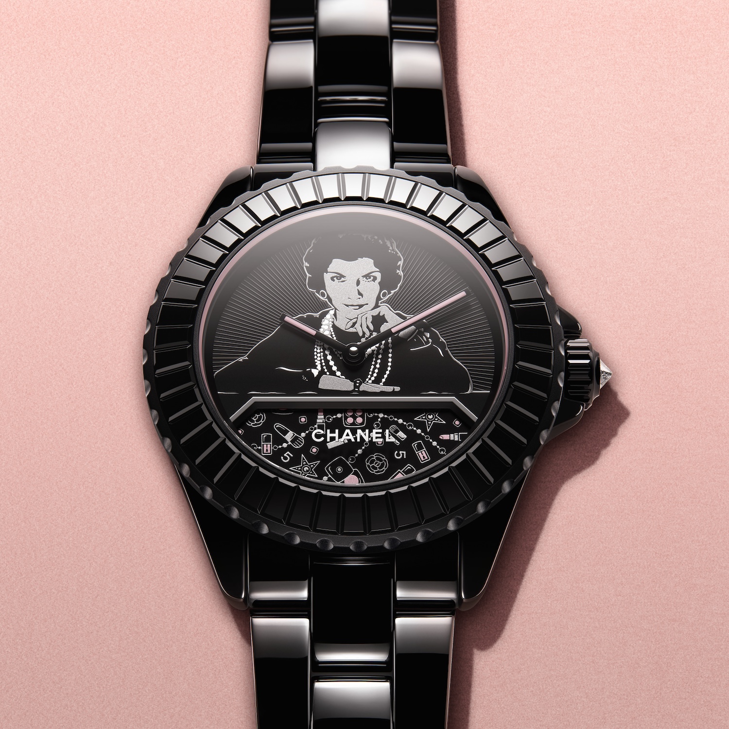 バゲットパターンをあしらったブラックのベゼルに囲まれたダイヤルに、モノトーンのマドモアゼル シャネルがメークアップテーブルに向き合う「マドモアゼル J12 BLUSH キャリバー 12.1」。5分間で一周する回転ディスクに描かれたアイシャドウ、パウダー、リップスティックといったメークアップアイテムを、パウダリーなシルバーとピンクトーンの転写シールで繊細に再現しています。