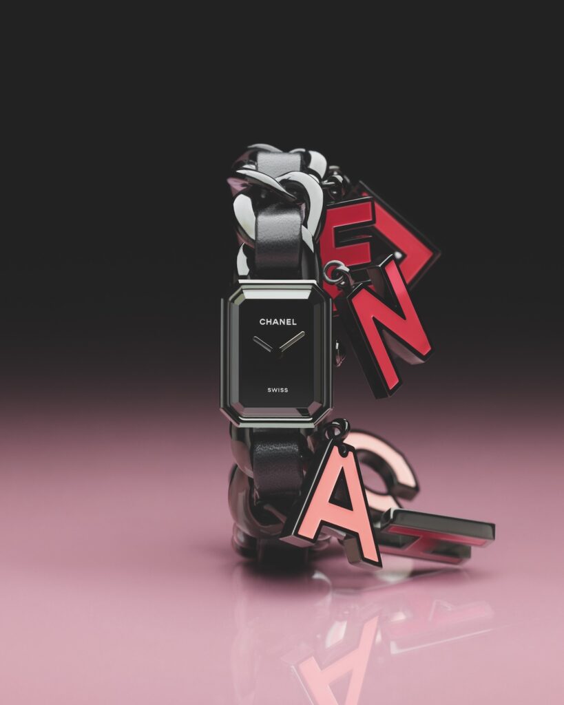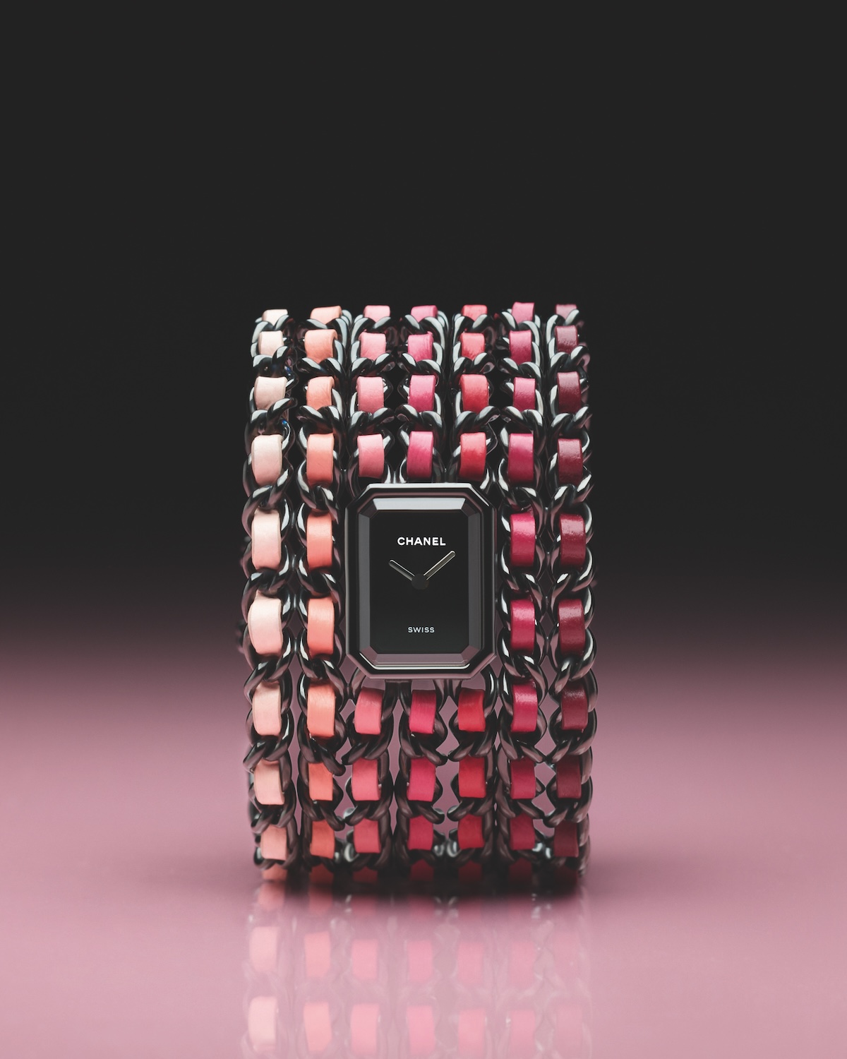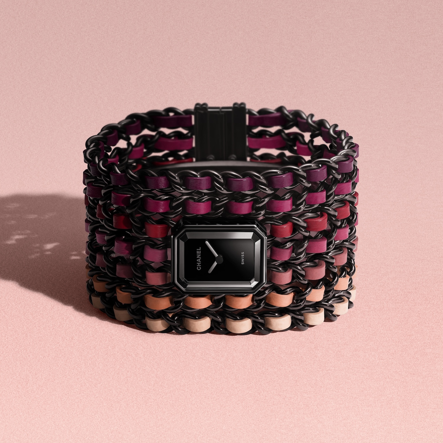 リップスティックのようなピンクとレッドのカマイユ(単色表現)で遊んだ「プルミエール カフ BLUSH」。ガブリエル シャネルが大切にしていた女性らしさを体現しています。ブラックのチェーンにレザーを編み込んだ7連のカフブレスレットは、7本のチェーンそれぞれにピンクやパープルのシェードを纏います。中心には八角形のケースとシンプルなブラックのダイヤルをセット。
