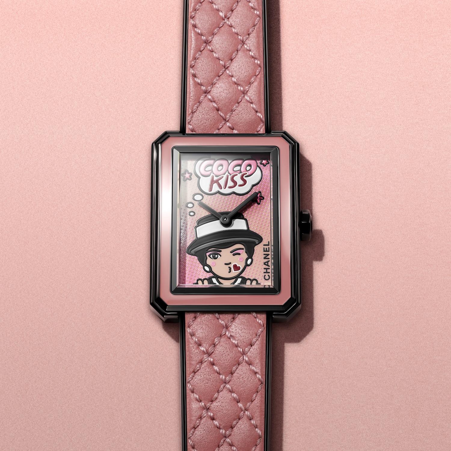 ピンクのグラデーションの“COCO KISS”の文字が印象的なこのモデルは、キルティングを施したピンクのカーフスキンストラップや、手作業で塗布したベゼルのピンクラッカーといったピンクの世界を、ブラックで縁取りすることでコントラストを生み出します。リューズを飾るブラックのスピネル カボションが仕上げのタッチを添えるアイテム。