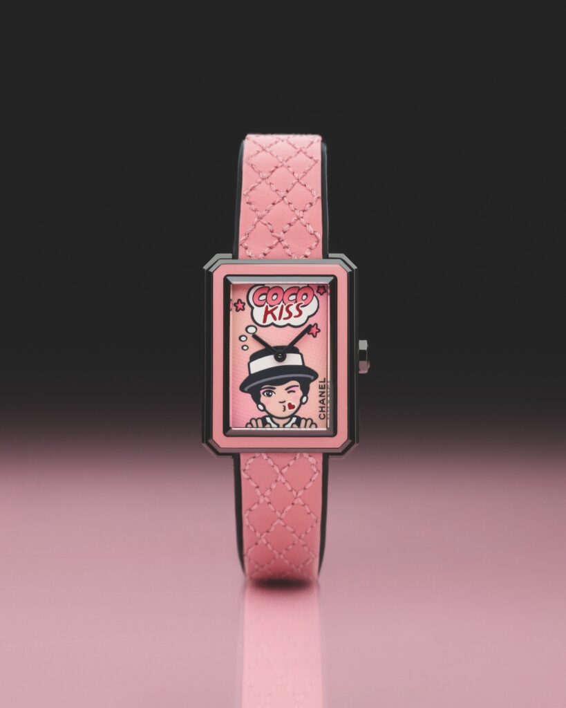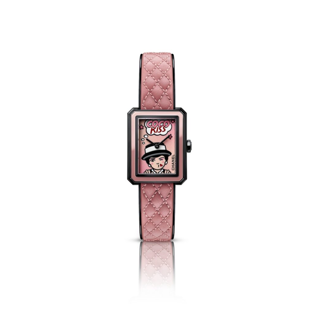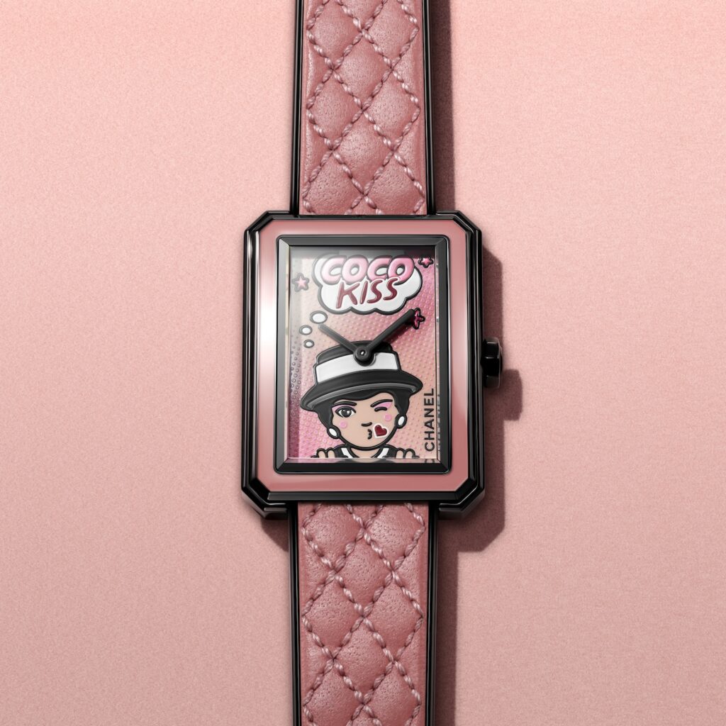 ポップ アートの明るいビジュアルにオマージュを捧げる「ボーイフレンド BLUSH」は、投げキスをするマドモアゼルのイラストをダイヤルに描いています。