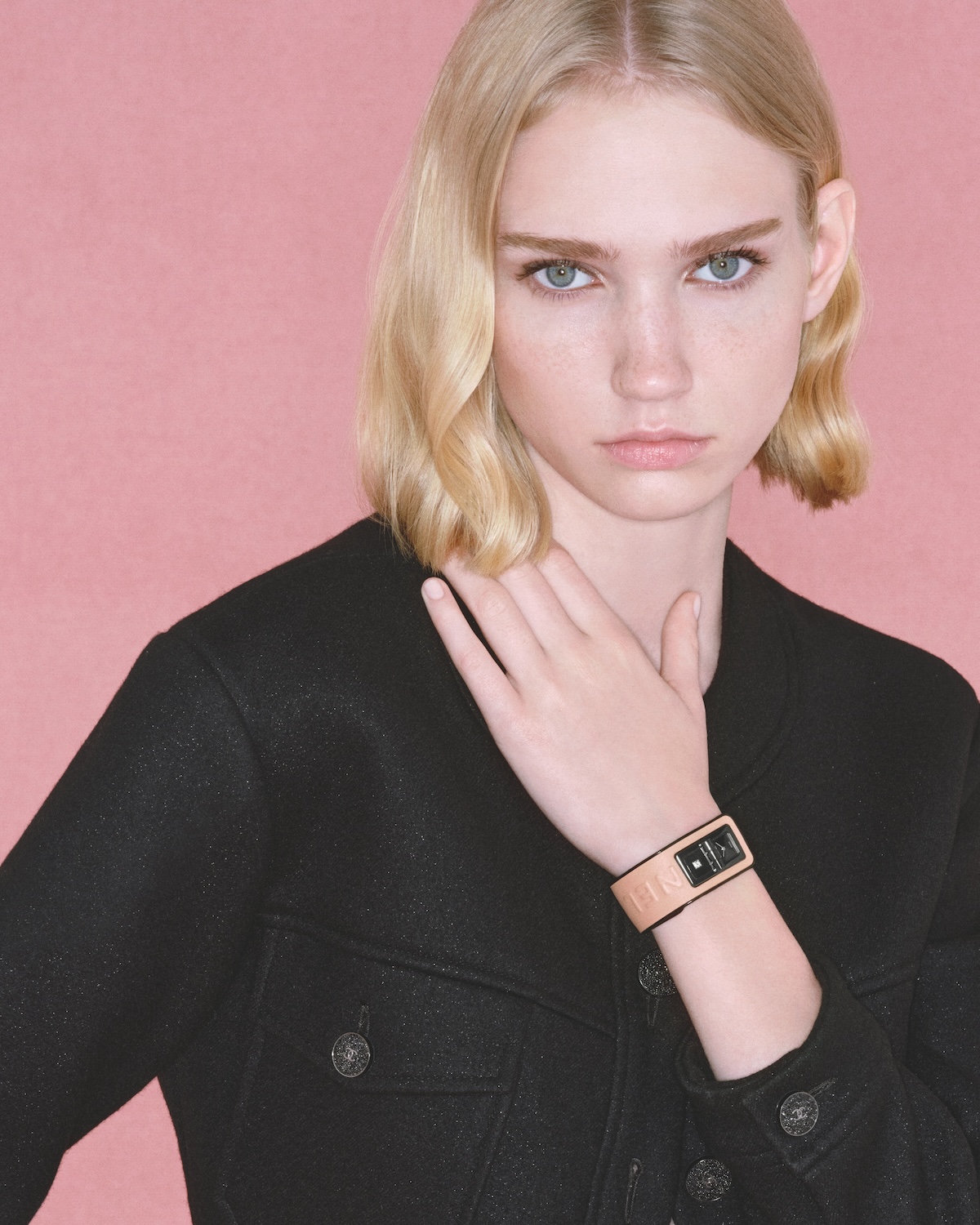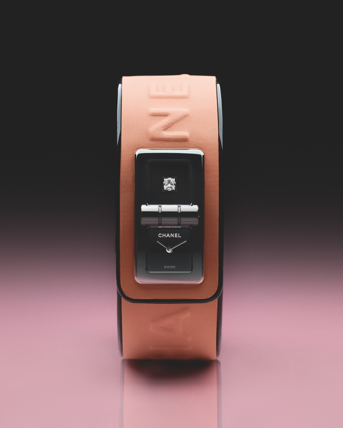 ピンクのカーフスキンストラップにCHANELの文字をエンボスした「コード ココ BLUSH」。アルファベット6文字の存在感が視線を引き寄せるピンクのストラップの裏地や、2.55のハンドバッグに着想を得たターンロック式のクラスプにブラックのアクセントを添えています。2つのブラックラッカーダイヤルのうち1つにはダイヤモンドがセットされています。