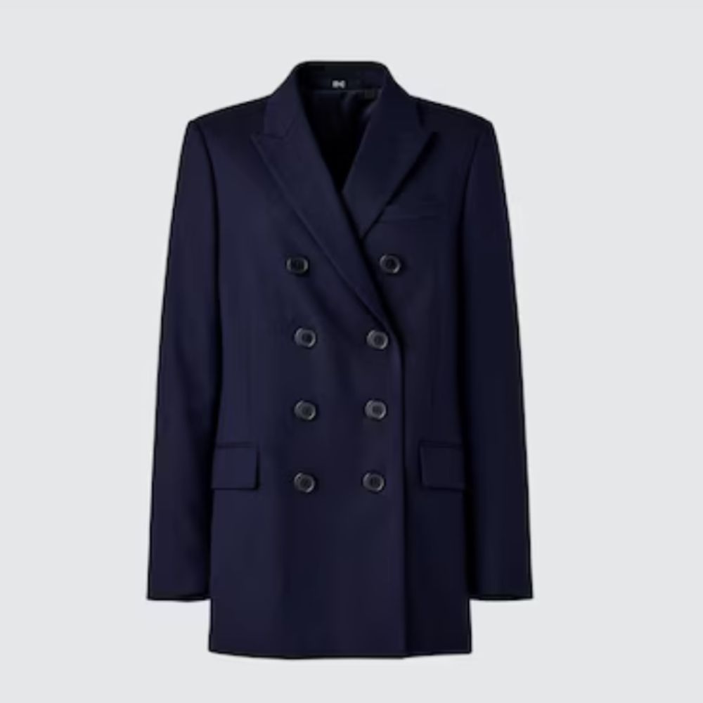 ダブルブレストで立体的な衿元は、顔周りをぐっと引き締めて見せてくれるデザイン。肩パットが自然にシルエットを整えてくれてるから、Tシャツやタンクトップにさらっと羽織るだけで簡単に“きちんと見え”できます。