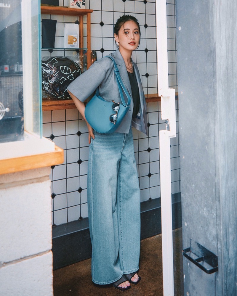 8月15日(金)、オフィスでも活躍する半袖ジャケットは、サテンのツヤ感に淡色デニムを合わせて、休日仕様にシフト。ハイウエストのワイドデニムでカジュアルダウンしつつ、アクセの重ね付けやシアーサンダルで遊び心もプラス。ブルー系のワンハンドルバッグが、全体を洗練された印象に引き上げます。