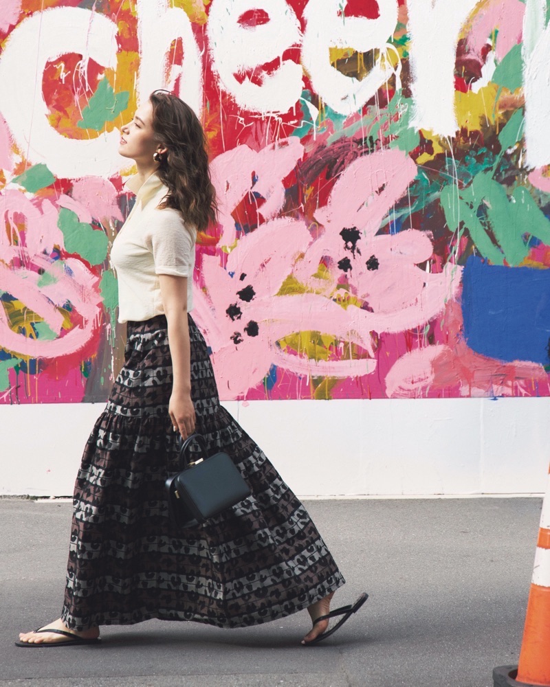 ビーサン¥2,499ピアス¥5,499(ともにH&M/H&M カスタマーサービス)ポロニット¥19,800(マイカ アンド ディール/マイカ アンド ディール 恵比寿店)スカート¥53,900(ダブルスタンダードクロージング/フィルム)バッグ¥51,700(PUNTI./エルディスト ショールーム)