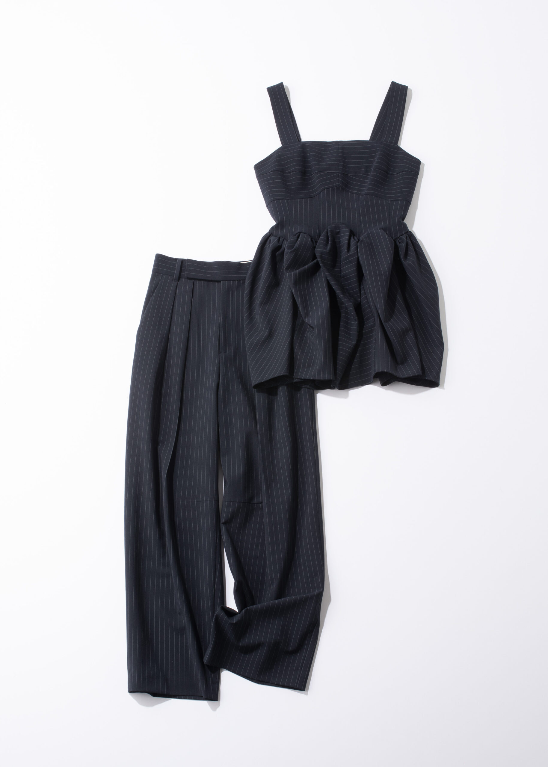 ふんわりとしたペプラムシルエットがフェミニンな印象を与えるトップス。バックにはシャーリングを施しているため、フィット感のある着心地を演出します。ボトムスはストレートシルエットですが、センターラインが効いていてすっきりとした印象に。ビスチェ¥28,600パンツ¥28,600(ともにカデュネ プレスルーム)