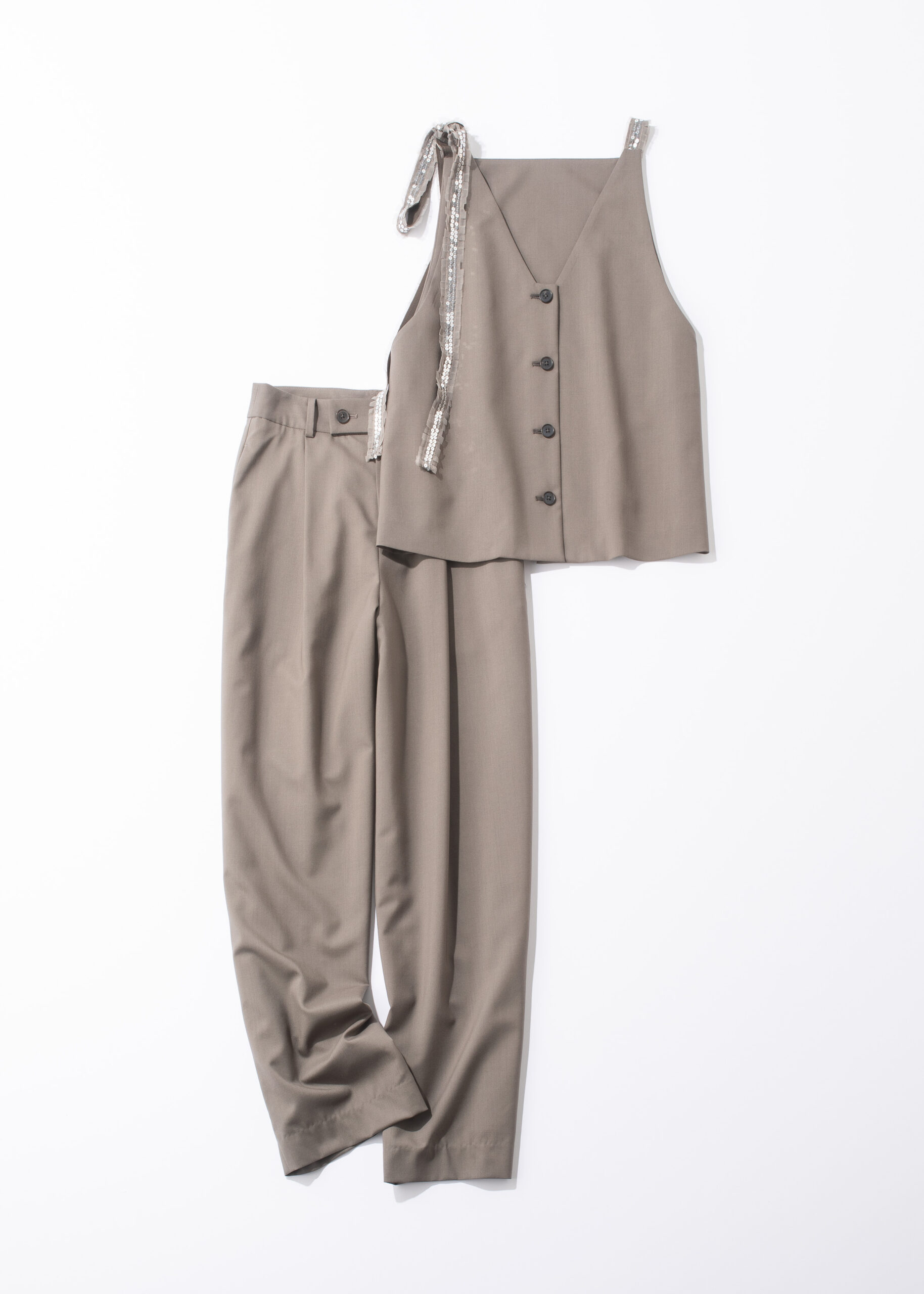Vネックのボタン開きを前にジレとしても着用できるトップスは、オリジナルの刺繍ブレードを使用。スパンコールとチュールのコントラストが華やかな印象に。ボトムスはメンズライクなゆとりが緩やかなカーブシルエットを描いてくれます。ビスチェキャミソール¥40,700パンツ¥40,700(ともにイウエン マトフ/ユナイテッドアローズ 渋谷スクランブルスクエア店)