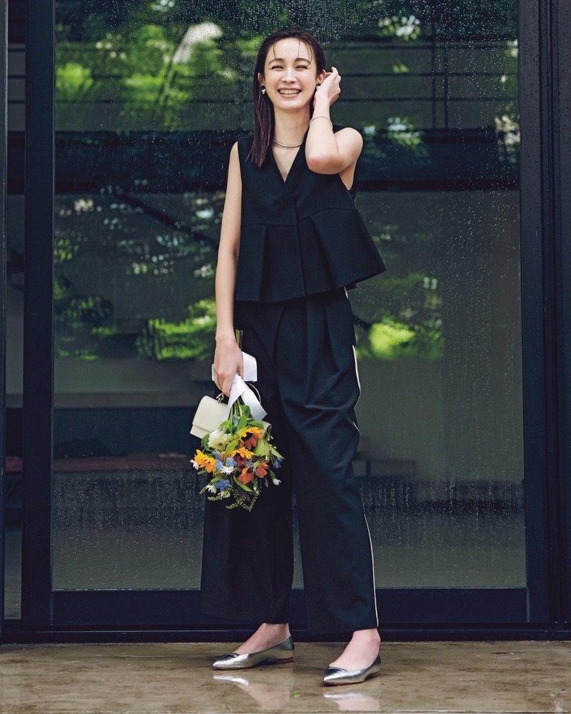 ジレ¥24,200パンツ¥22,000(ともにルーニィ)バッグ¥10,900(CHARLES & KEITH/CHARLES & KEITH JAPAN)パンプス¥72,600(ペリーコ/アマン)イヤリング¥16,500(タルパ/ススプレス)チョーカー¥4,950(GOLDY)バングル¥9,720(アビステ)リング¥20,900(イットアトリエ/フォーティーン ショールーム)