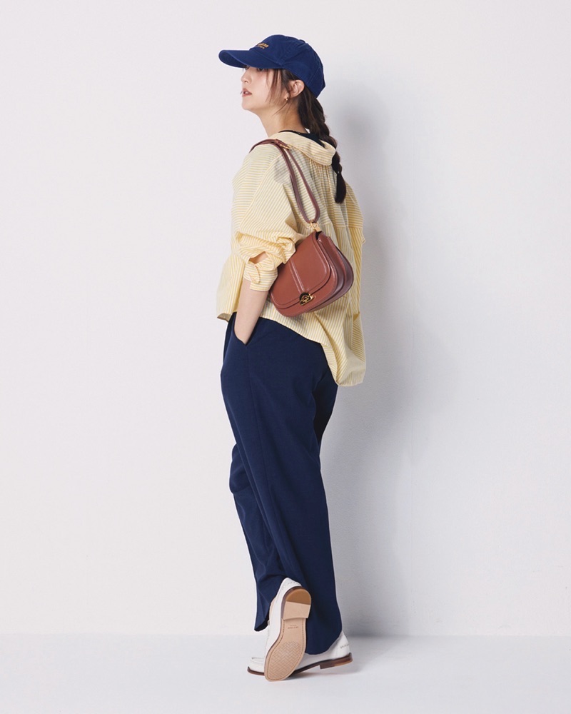 8月23日(土)、ゆったりとしたシルエットのイエローストライプシャツは、襟を抜いたり袖をまくったりと着こなしでこなれ感を演出。合わせた濃紺のストレートパンツは、カジュアルなのに素材できちんと見えも叶うアイテム。足元は白のローファーでクリーンに仕上げて、都会的な軽やかさをプラス。アクティブさと品のよさが両立した、大人のためのヘルシーカジュアルコーデです。