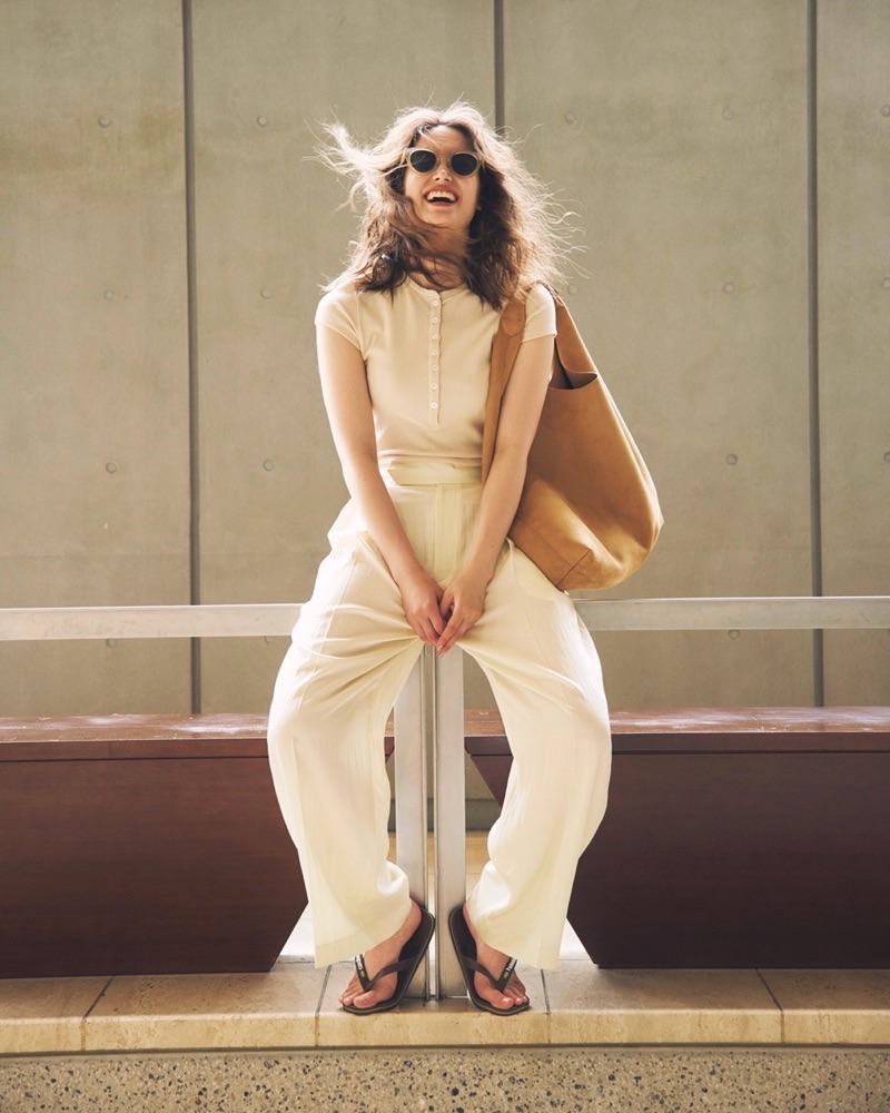 8月24日(日)、ルーズな白のワイドスラックスにフィット感のあるトップスを合わせて、メリハリのあるスタイルに。足元はフラットなビーサンでも、ハイウエスト&ウエストインでしっかり脚長効果。全身をアイボリー系のワントーンでまとめれば、ラフなビーチサンダルも清潔感のある印象に。軽やかで爽やかな空気感は、日曜日のアクティブなお出かけにもぴったりです。