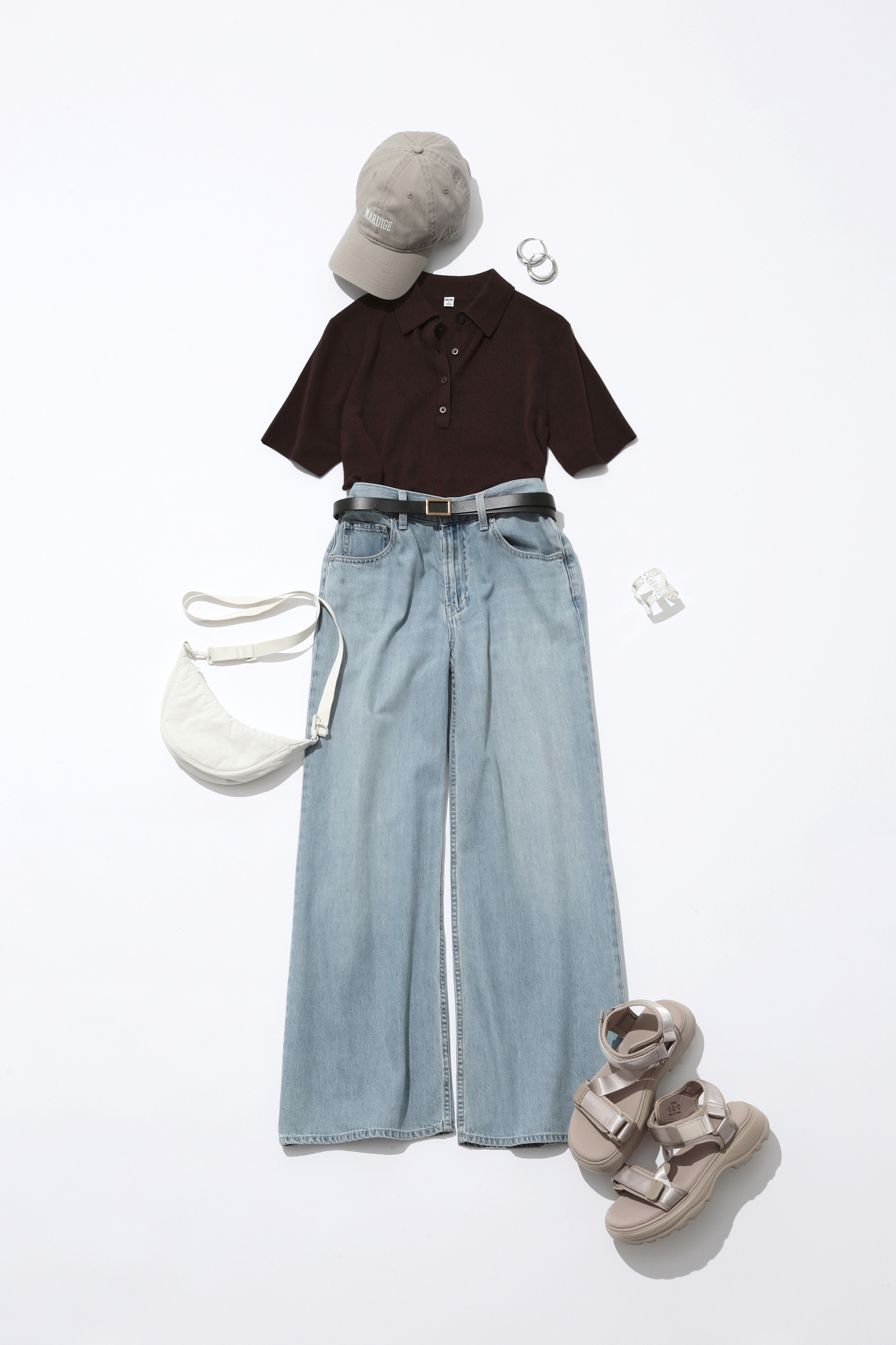 ユニクロの大HIT商品である半袖ニットポロのブラウンをメインに、キャップとスポサンをベージュにしてトーンを統一。仕上げに白のバッグを投入して明るさをプラス。豊富なカラバリだからイロチ買いしておけば、コーデに色を足したい時のワンポイントとしても活躍してくれます。