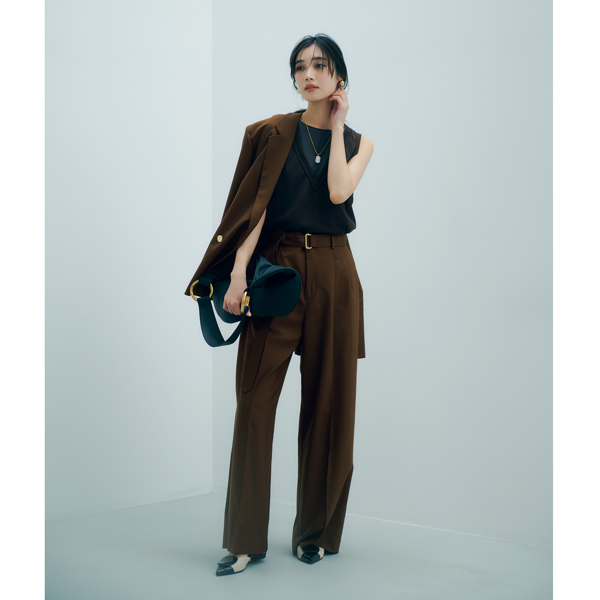 通勤服がつい黒やグレーに偏りがちな人こそ取り入れたいのが、ブラウンのセットアップ。モノトーンにはない奥行きが生まれて、シックさと柔らかさを兼ね備えた印象に仕上がります。インナーに黒を差せば端正さもキープでき、都会的な通勤スタイルへとアップデート。