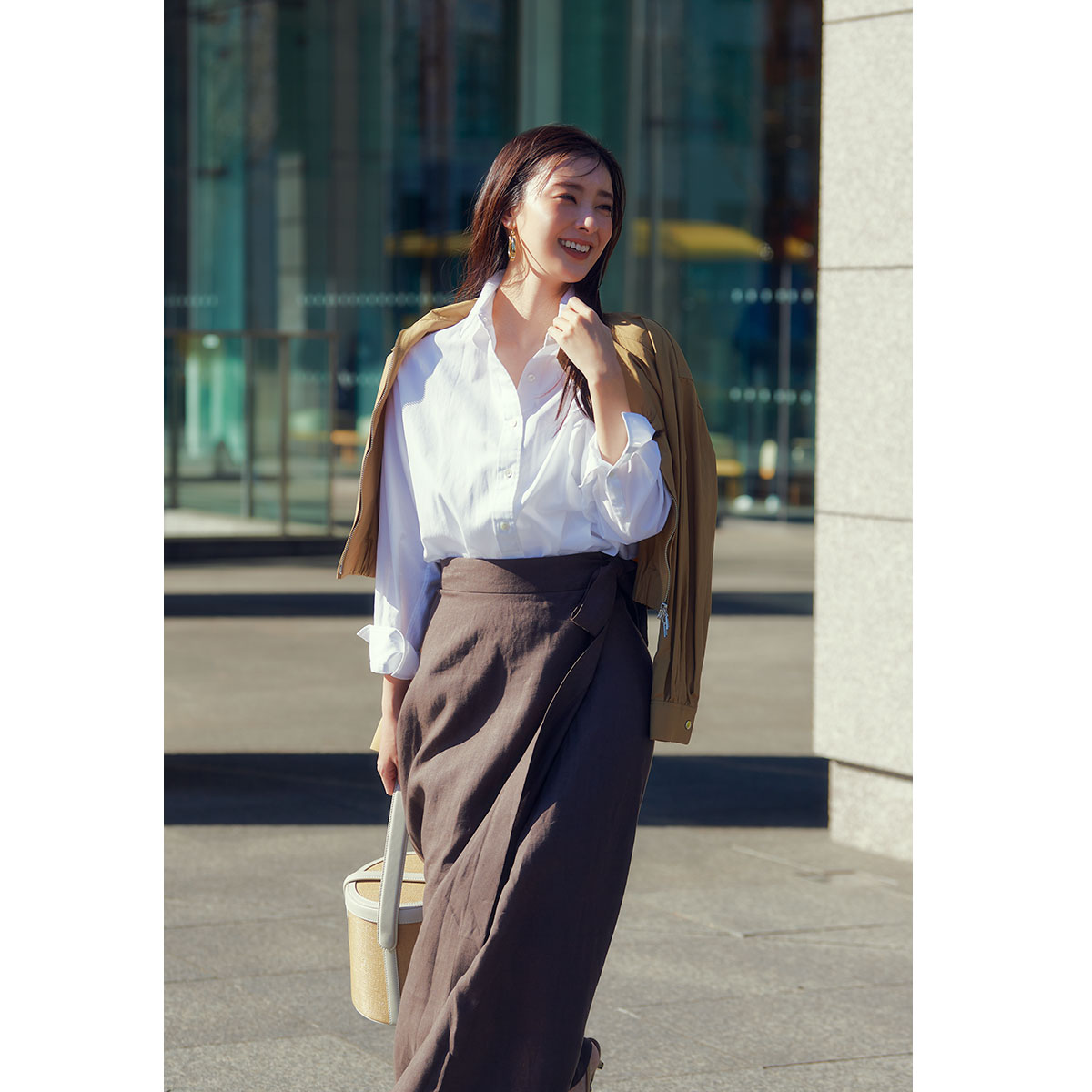白シャツ×ブラウンスカートのシンプルなワンツーに、ベージュのブルゾンを肩掛けして軽快に。ぱきっと映える白シャツが全体を引き締め、清潔感を添えてくれるのもポイントです。きちんと感のある組み合わせながら、ラップ風デザインのスカートがほどよい抜けを演出して、こなれた通勤スタイルが完成。