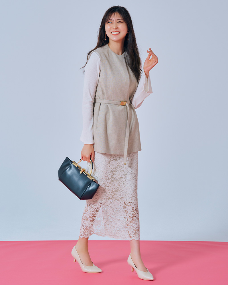通勤シーンには、ベージュや白を基調にした淡色コーデが頼れる存在。やわらかな配色が優しげな雰囲気を演出しつつ、ジレのウエストマークで品よく引き締まります。レーススカートで華やぎを添え、黒のキレイめバッグで全体を凛と整えれば、好印象な大人の通勤スタイルに着地。