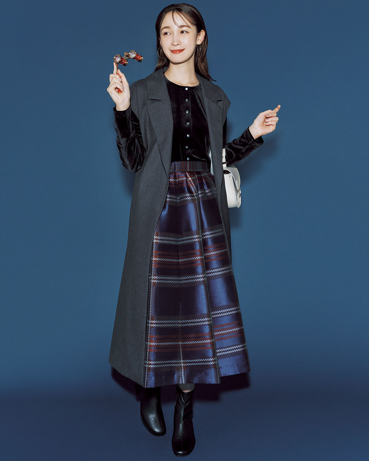 深みのあるネイビーに光沢を宿したチェック柄スカートは、秋らしい存在感を放つ主役アイテム。ロングジレを重ねることで縦のラインが強調され、すっきりとした印象に。ベロアのトップスやレザー調のブーツで素材に変化をつければ、クラシカルでリッチなムードが漂います。