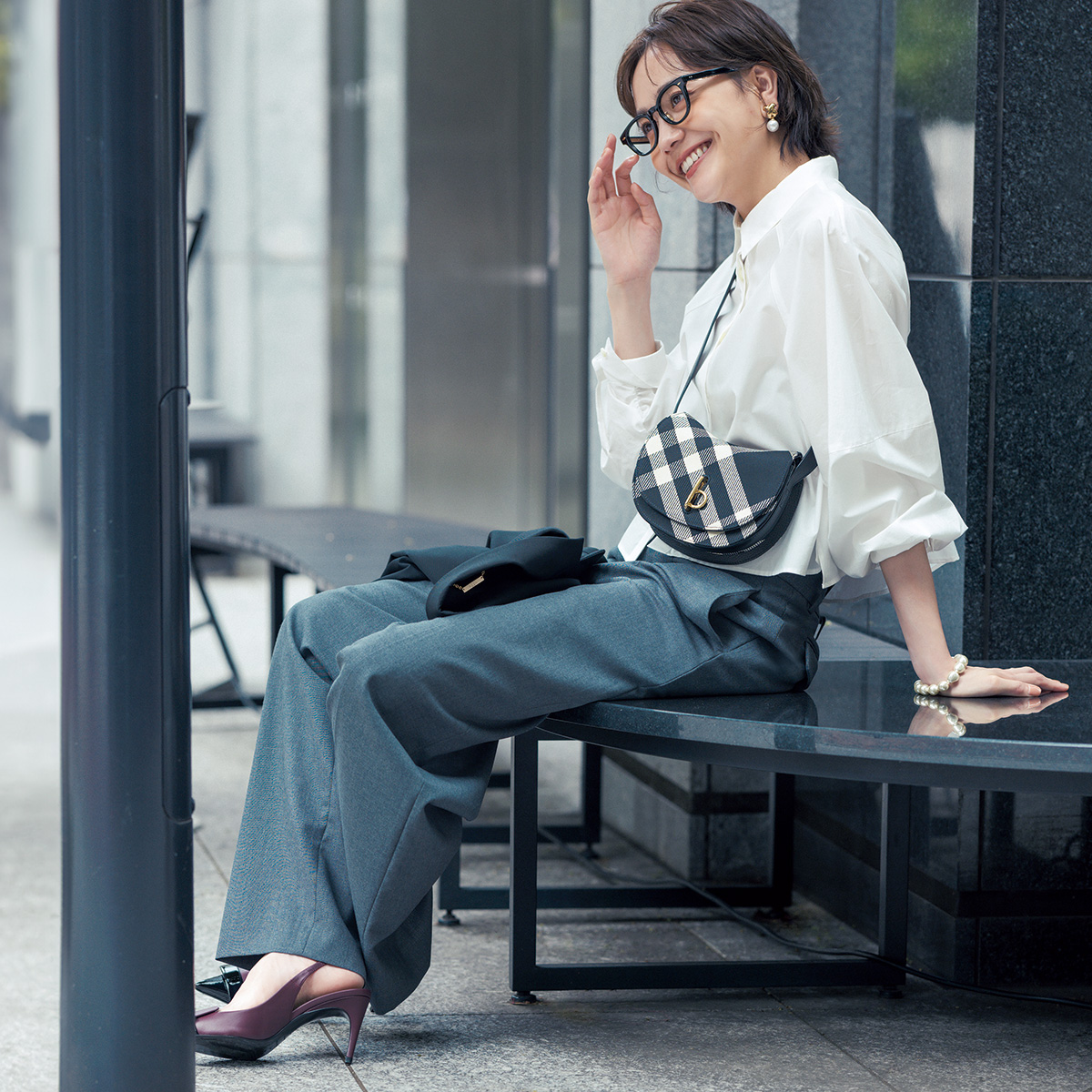 普段無地が多くてチェックを取り入れるのがは少し気が引ける……そんなときは小物でさりげなく取り入れるのがおすすめ。白シャツ×ワイドパンツのシンプルコーデにチェック柄バッグを効かせれば、それだけで鮮度がアップします。大人らしい落ち着きはそのままに、遊び心のあるアクセントで着こなしをぐっと格上げ。
