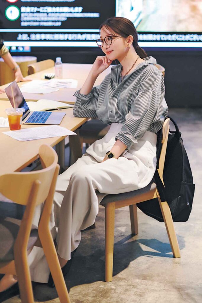 カジュアルな印象のあるギンガムチェックシャツも、落ち感のある白ワイドパンツを合わせればぐっと大人顔に。タックインで腰位置が高く見え、スタイルアップ効果も抜群です。眼鏡や腕時計といった小物で知的なムードをプラスすれば、オフィスにも馴染むきれいめコーデに。