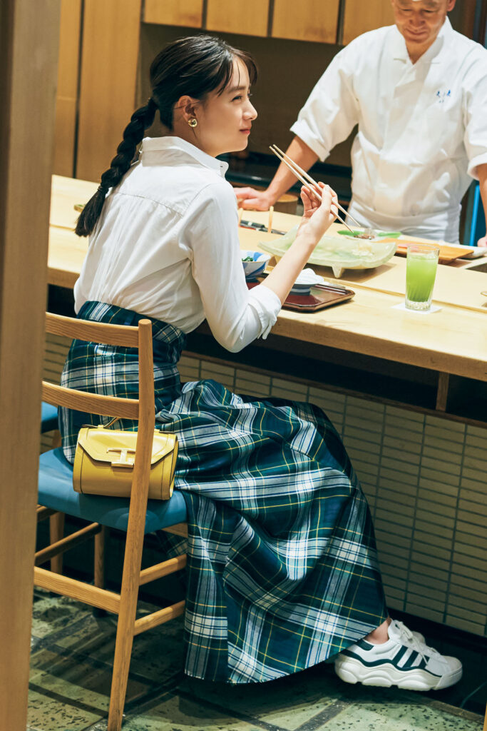 クラシカルなタータンチェックのスカートに白シャツを合わせて、凛とした清潔感をプラス。きちんとした印象をキープしつつ、足元のスニーカーで肩の力を抜けば、鮨屋やカフェなど外食シーンにもぴったり。華やかさと軽やかさを両立した、新鮮なキレイめカジュアルが完成します。