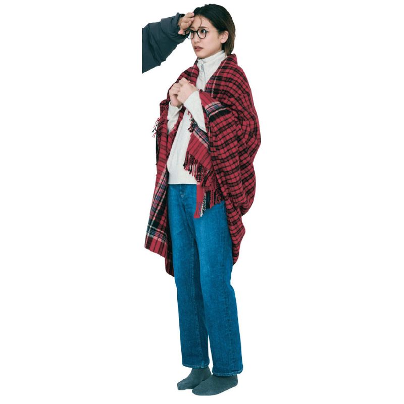 【赤チェックの大判ストールでカジュアルに華やぎをプラス】