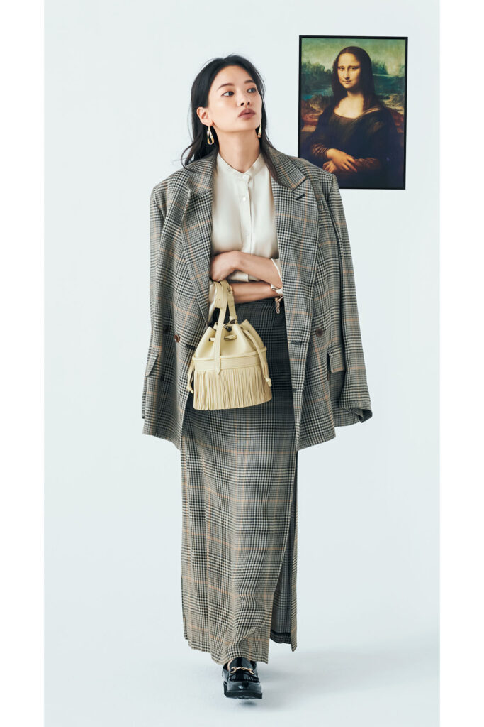芸術の秋にぴったりなのが、グレンチェックのジャケット×スカート。美術館に出かけたくなるような知的なムードが漂います。ハンサムなチェック柄に白ブラウスを合わせて女性らしく仕上げつつ、フリンジバッグで大人ならではの余裕を添えて。