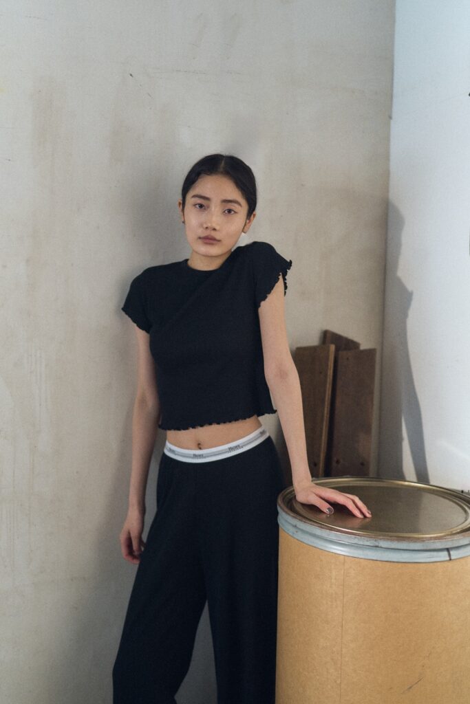 凸凹のあるテレコ素材は肌離れと伸縮性が良く、心地良いフィット感。短めの袖・袖ぐりのメローは軽やかな印象で、華奢な肩周りを演出します。短めの丈で、トレンドのハイウエストボトムスとのコーディネートに最適です。サイドに縫い目がない丸胴仕様なので、体に触れる当たりが少ないのもポイント。首元にネームデザインをプリントするタグレス仕様で襟ネームの肌当たりを解消し快適な着心地です。同素材を使用したロングワイドパンツ(HW9-C101)とのセットアップもお薦めです。ちょっとした小物を収納できるリユース可能なエコパッケージ。