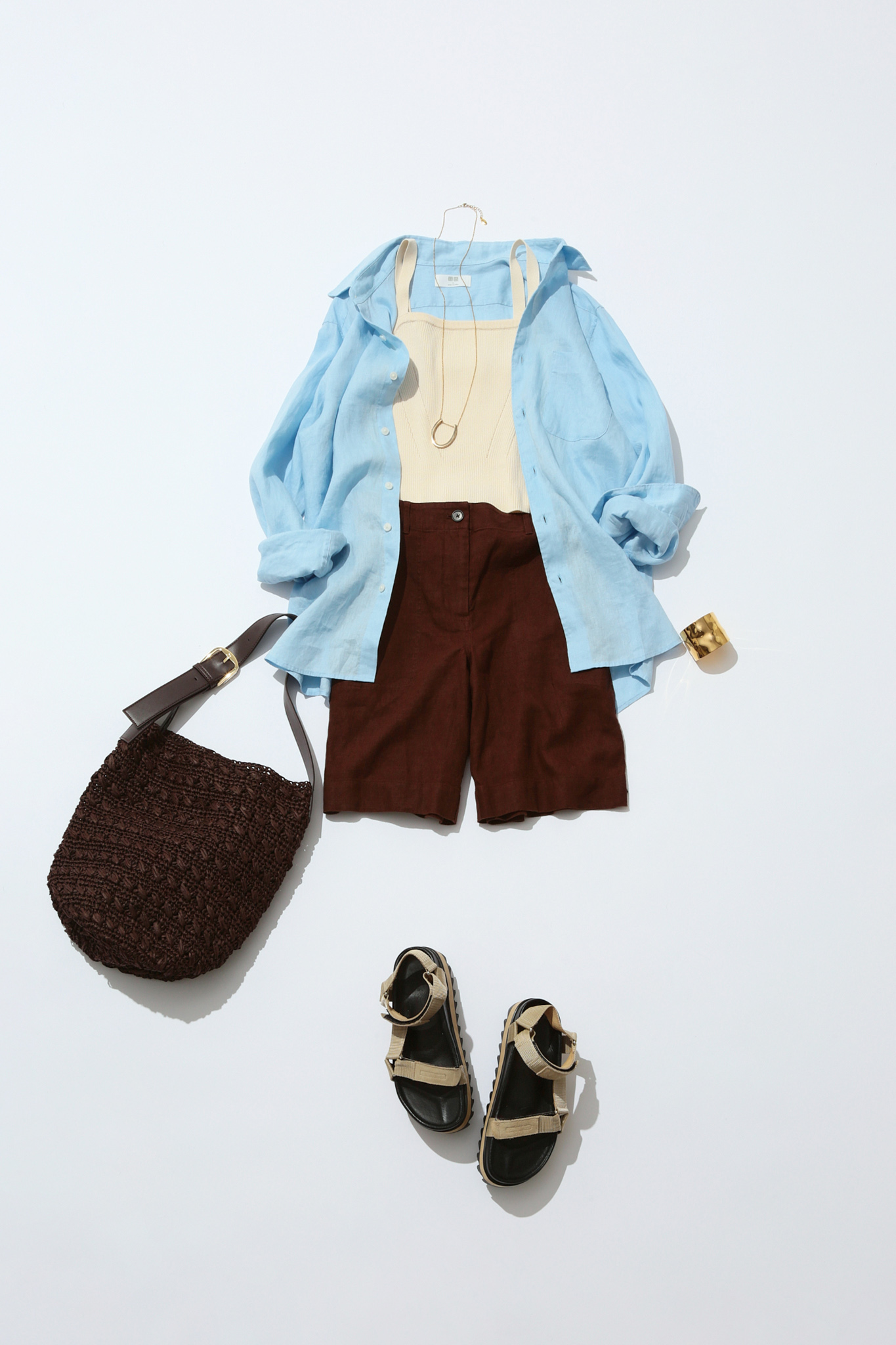 シャツ(メンズ)「プレミアムリネンシャツ」¥3,990(UNIQLO)タンクトップ¥6,050(ココ ディール)ショートパンツ¥15,000(バナナ・リパブリック)バッグ¥9,990(マンゴ)サンダル¥35,200(ヨーク/UTS PR)ネックレス¥5,940(アビステ)バングル¥61,600(ソコ/ZUTTOHOLIC)