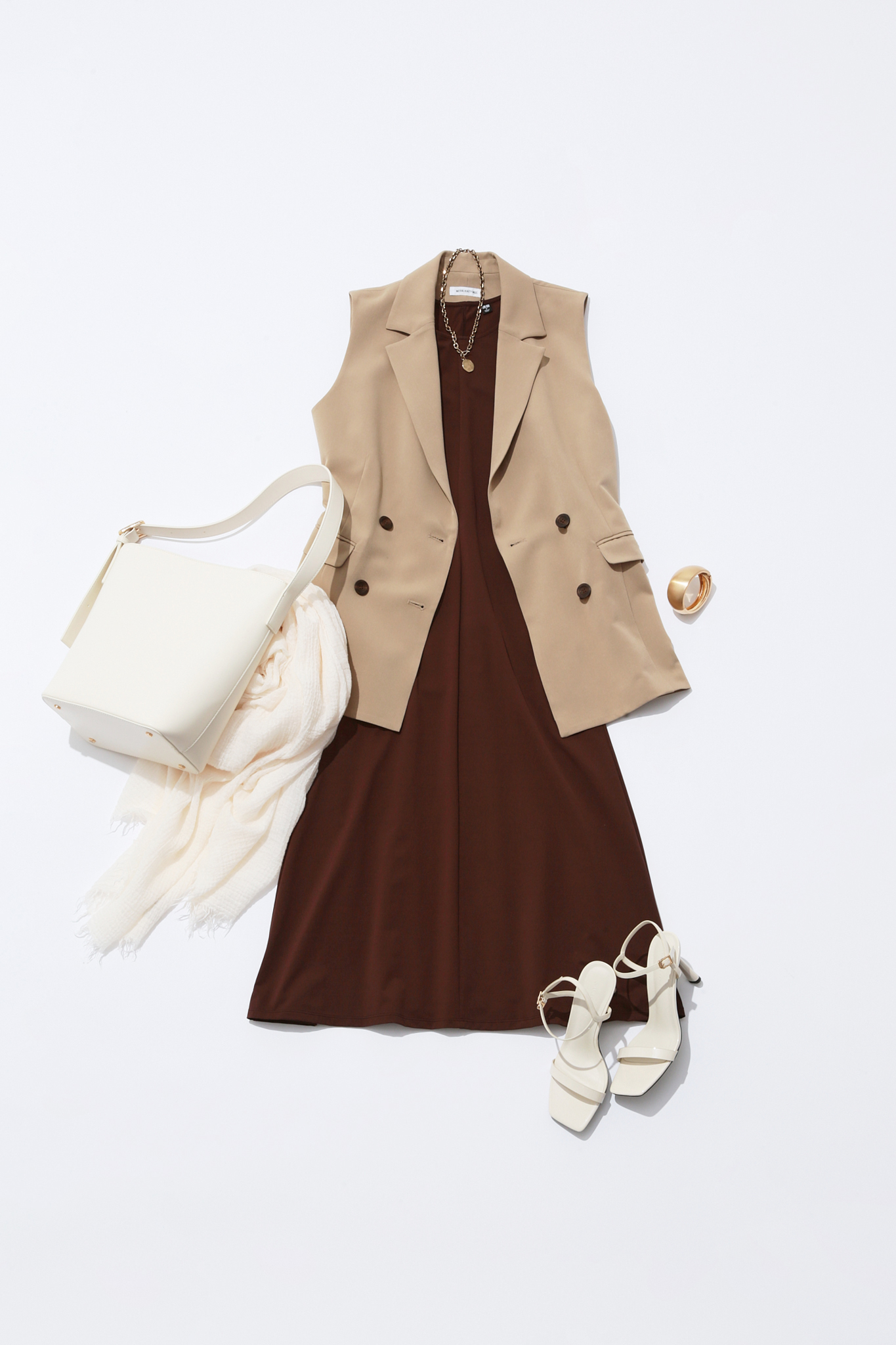 ユニクロの「ウルトラストレッチワンピース」はきゅっと締まったウエストと上品なフレアシルエット、さらにドライと接触冷感という高機能。トレンドのジレを合わせることでより細見え効果が。靴やバッグをホワイトでトーンアップすることで洗練された雰囲気に。