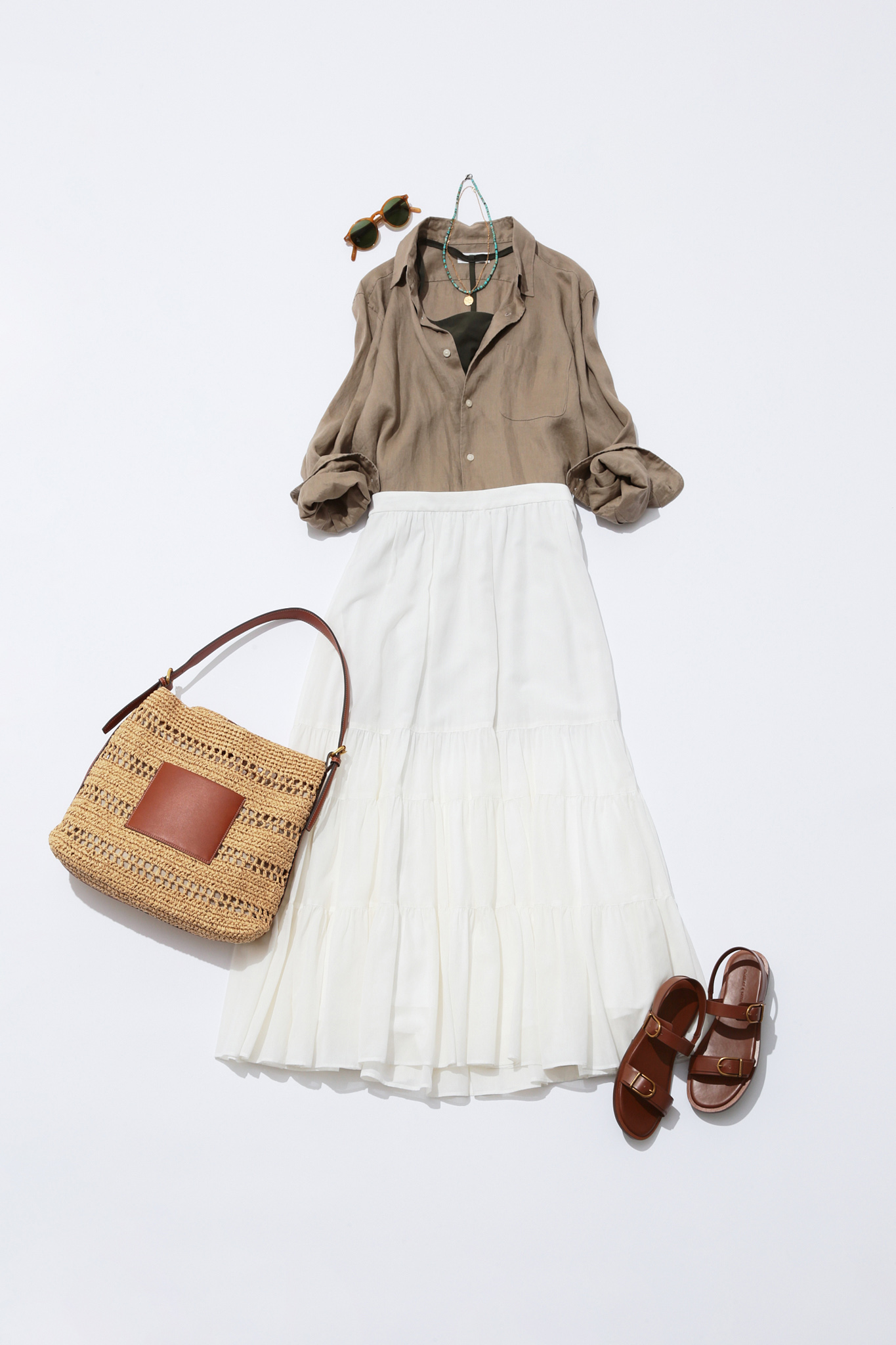 軽やかな白フレアスカートはともすると甘くなりすぎてしまう場合も。そんな時は落ち着いたベージュ系のアイテムで引き締めて、コーデのバランスを取れば安心。ユニクロの「プレミアムリネンシャツ」はメンズを選ぶとオーバーサイズで今どきです。