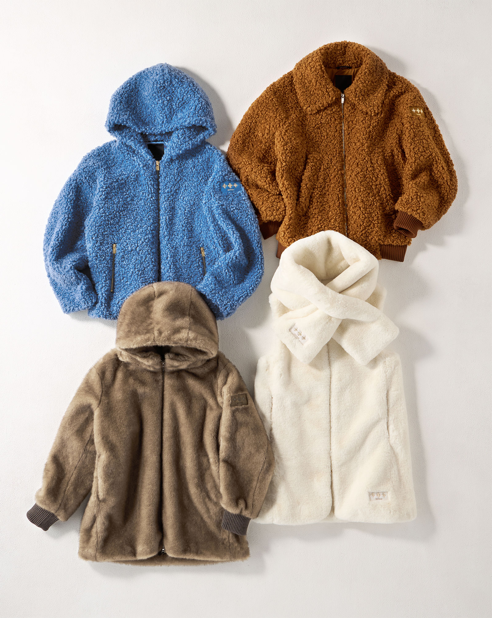〈左上から時計回りに〉カジュアルに着られる大きめフード×シープ調ボア。メタルファスナーが品のよいアクセントに。ブルゾン[IPAMA]¥70,400大きな衿とヒップまでかかる丈感で、今どきシルエットに。袖と裾のリブで上品ながらスポーティなムードに。ブルゾン[RAMACCA]¥83,600縦長シルエットを作るロングベストは、同素材のマフラーもラインナップ。ベスト[POLLINA]¥66,000マフラー[MENISA]¥29,700まるでリアルファーのようなラグジュアリーな質感で、保温性も抜群。顔周りをたっぷりと覆うボリュームフードが特徴。ブルゾン[ARABIS]¥77,000(すべてタトラス/タトラス 銀座店)