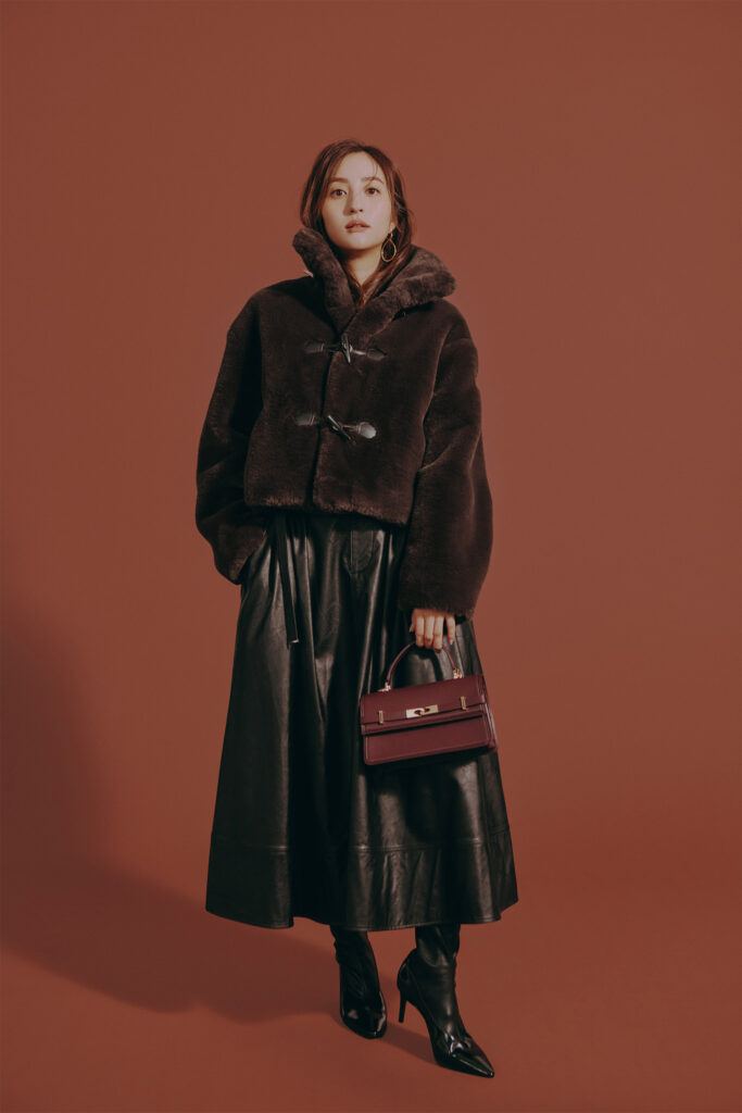 コンパクトな丈感でバランスよく着られる、正統派ダッフルコートのディテールを落とし込んだ新モデル。どこまでもなめらかでリッチなファー調ボアは、一度触れればたちまち虜に。チョコレートのようなトレンドのブラウンのほか、ライトグレーやホワイトなどベーシックカラーが揃います。ブルゾン¥77,000スカート¥48,400(ともにタトラス/タトラス 銀座店)バッグ¥11,900ブーツ¥12,900(ともにチャールズ&キース/CHARLES & KEITH JAPAN)ピアス¥14,300〈サローネ サーティ〉(フォーティーン ショールーム)