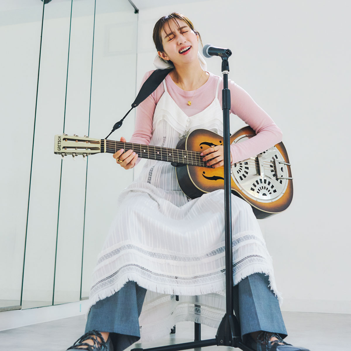 繊細なレースキャミワンピは、インナーにシアーなピンクのロンTを重ねて可愛らしさをひとさじ。さらにデニムを合わせることで甘さが中和され、今っぽいこなれ感のある仕上がりに。ラフさと華やかさを両立できるから、気分を上げたい日にぴったりです。