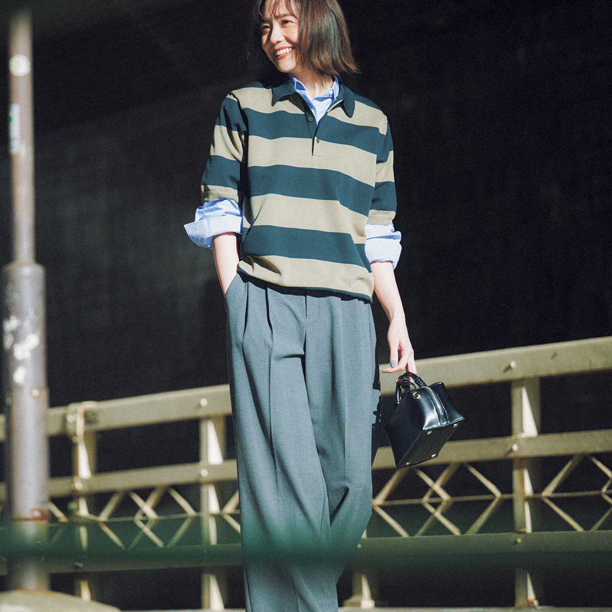 スポーティな印象の強いラガーポロも、ブルーシャツを重ねればぐっと洗練された雰囲気に。太めのボーダー柄が映えるうえ、衿元や袖口から覗くシャツが抜け感を演出してくれます。キレイめなスラックスを合わせれば、カジュアルさをほどよく抑えた大人の着こなしに。