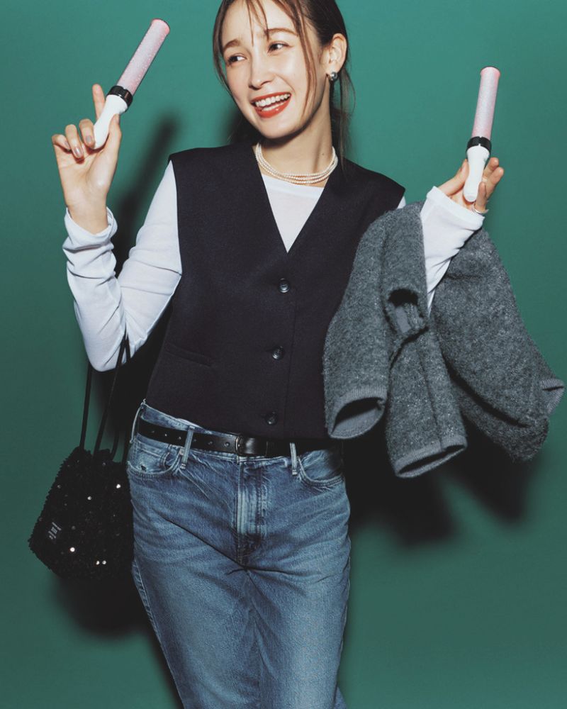 退勤後に推し活やイベントでテンションが上がる日こそ、体温調節がしやすいジレが頼りに。ロンT×デニムのシンプルな組み合わせに重ねれば、ラフすぎず今っぽいハンサム感がプラスされます。動きやすさもきちんと感も欲しい日にちょうどいい、短丈ジレならではのバランスを楽しんで。