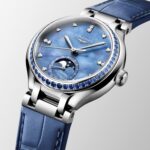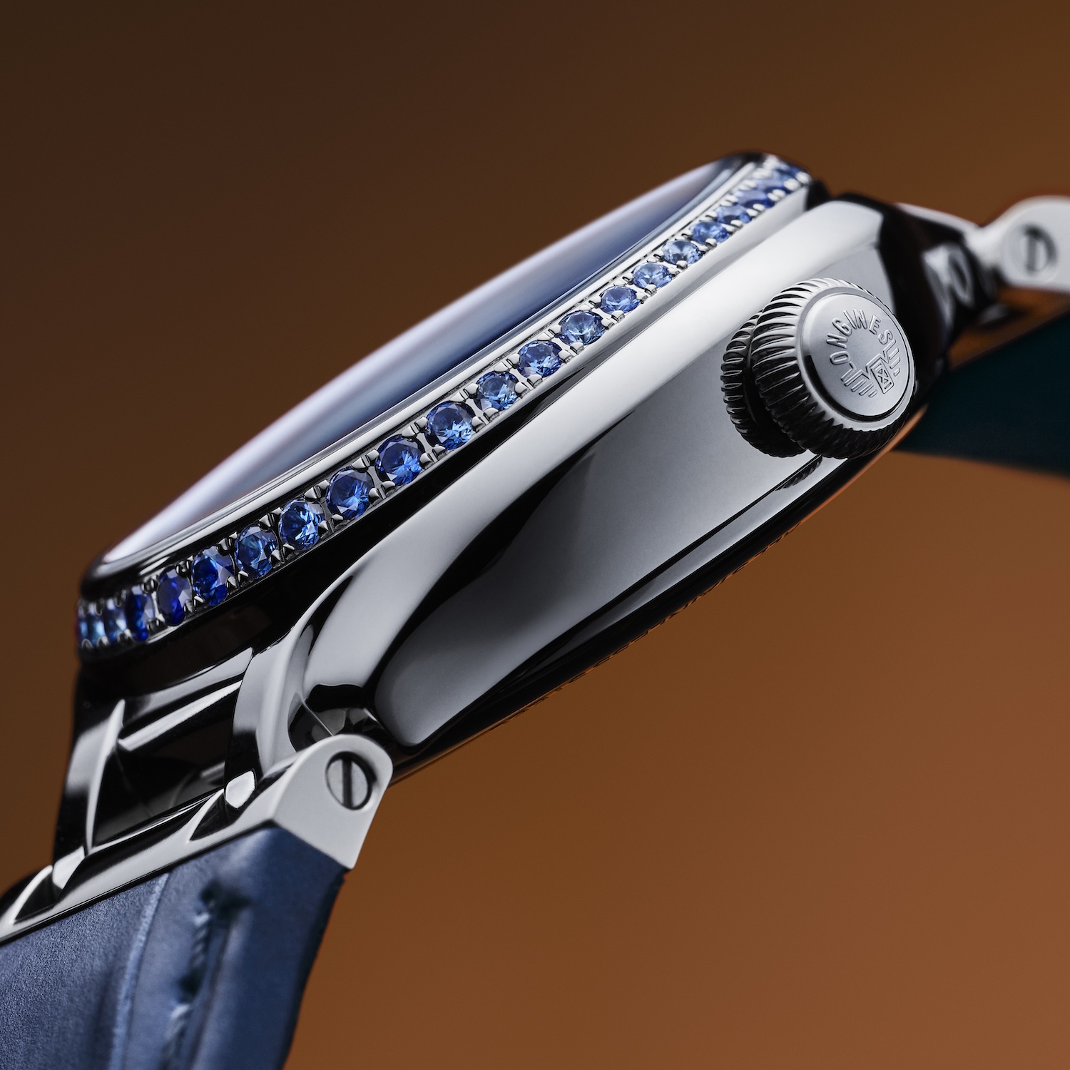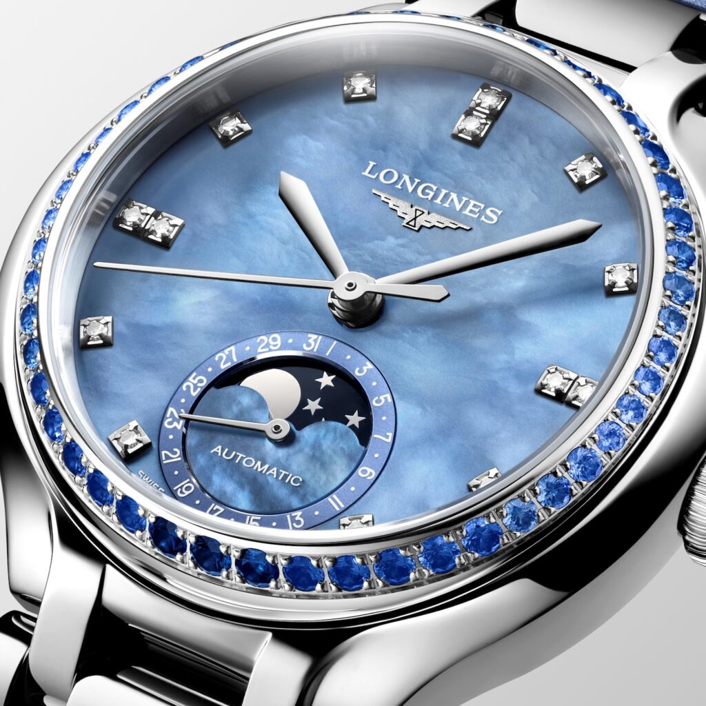 新生「ロンジン プリマルナ」コレクションの最高峰「プリマルナ ブルーサファイア」モデルは、4つの異なる色合いとサイズ(合計1.06カラット)を厳選した48粒のブルーサファイアが優美なグラデーションを描くジュエリーウォッチ。天空のように幻想的な「セレスティアルブルー」のマザー・オブ・パールダイアルには14粒のダイアモンドインデックスが煌めき、ムーンフェイズ複雑機構が静謐な美をたたえます。