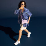 ボトムやインナーをオールホワイトで繋げばミニ丈も上品に。スリット入りのシャツは、クロスボディバッグをかけて動きを出すとメリハリが生まれます。シャツ¥26,400 タンクトップ¥13,200(ともにティッカ)ショートパンツ¥15,000(バナナ・リパブリック)サングラス¥48,400(アイヴァン/アイヴァン 東京ギャラリー)ブレスレット[ターコイズ]¥20,900 ブレスレット[ターコーズ×シルバー]¥19,800 ブレスレット[ターコイズ×ホワイト]¥13,200(すべてミキア)ピアス¥41,800(ウノアエレシルバーコレクション/ウノアエレ ジャパン)リング¥27,500(バルブス/ZUTTOHOLIC)スニーカー¥12,980(ニューバランス/ニューバランス ジャパンお客様相談室)バッグ¥24,200(nana-nana/ナナナナ)