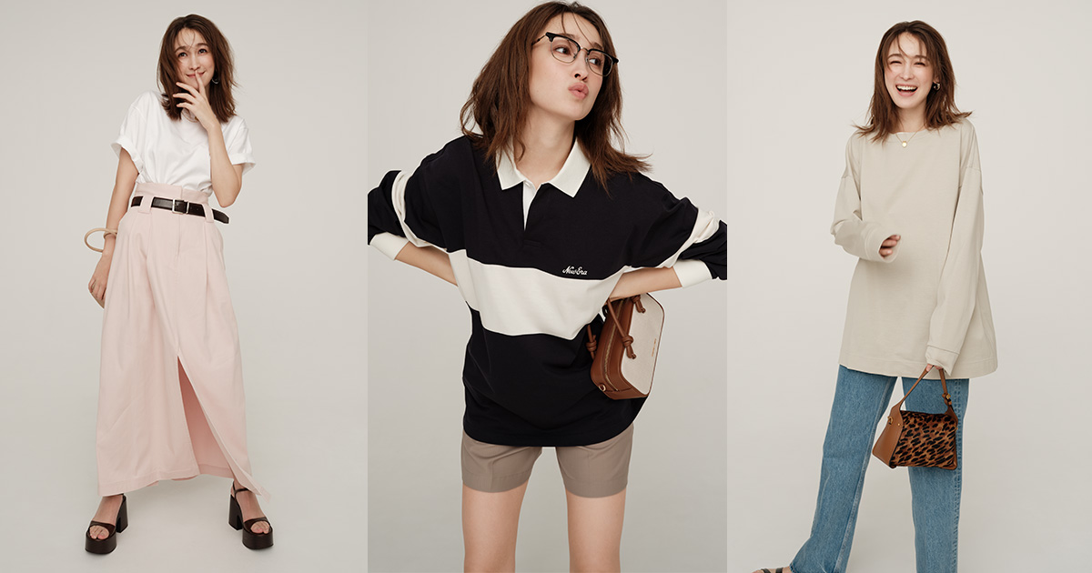 Tシャツ¥2,420(ヘインズ/ヘインズブランズ ジャパン カスタマーセンター)スカート[ベルト付き]¥19,800(SNIDEL/SNIDELルミネ新宿2店)バッグ¥48,400(ヴァジック/ヴァジックジャパン)ピアス¥38,000(ポレーヌ)コインネックレス¥280,500チェーンネックレス¥231,000(ともにGIGI/ホワイトオフィス)サンダル¥9,900(CHARLES & KEITH/CHARLES & KEITH JAPAN)