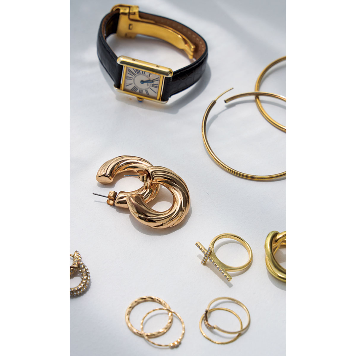 ジュエリーは断然ゴールド派で繊細なデザインが好み。手元のジュエリーはスタメンが揃っていて、基本的につけ変えることはありません。その代わり、顔の印象を左右するピアスは、洋服とのバランスを見て必ずチェンジ。ラフなTシャツの日には、ぽってりと重厚感のあるピアスで全体を引き締めたり、逆にコンサバなリブニットには、大ぶりかつ極細なフープピアスで抜け感を出したり。さりげなく印象を変えてくれるピアスが、その日のムードを映すキーアイテムになっています。