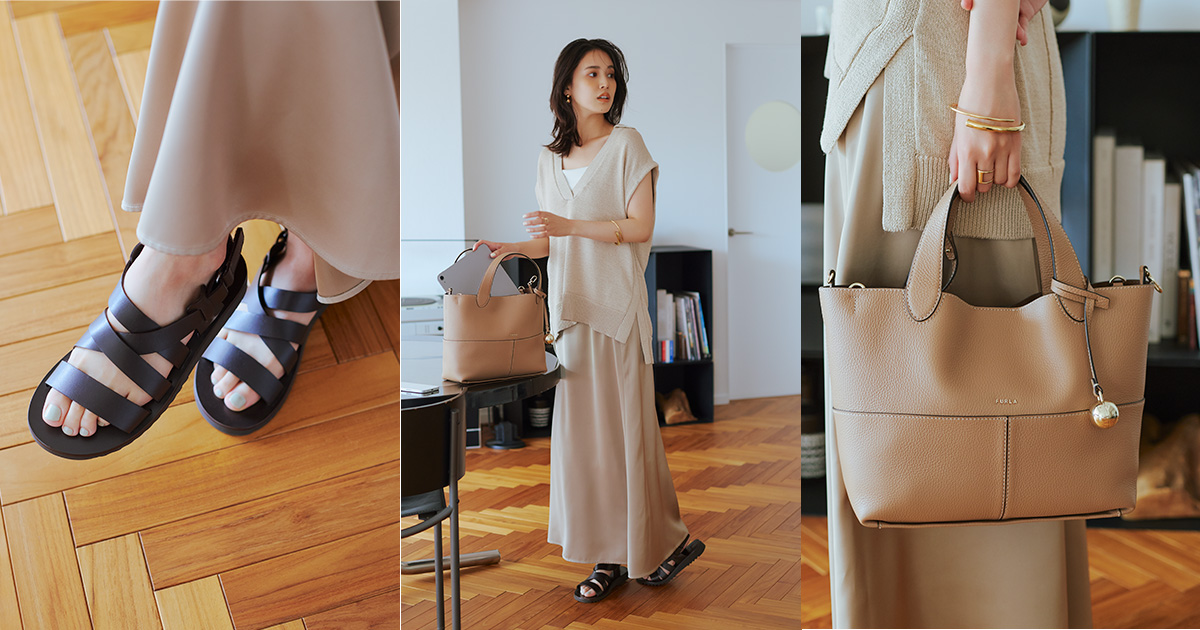 端正なレザーバッグにメンズライクなサンダル。きちんと感と抜け感。計算されたバランスで、ワントーンがぐっとリッチに、表情豊かに。
