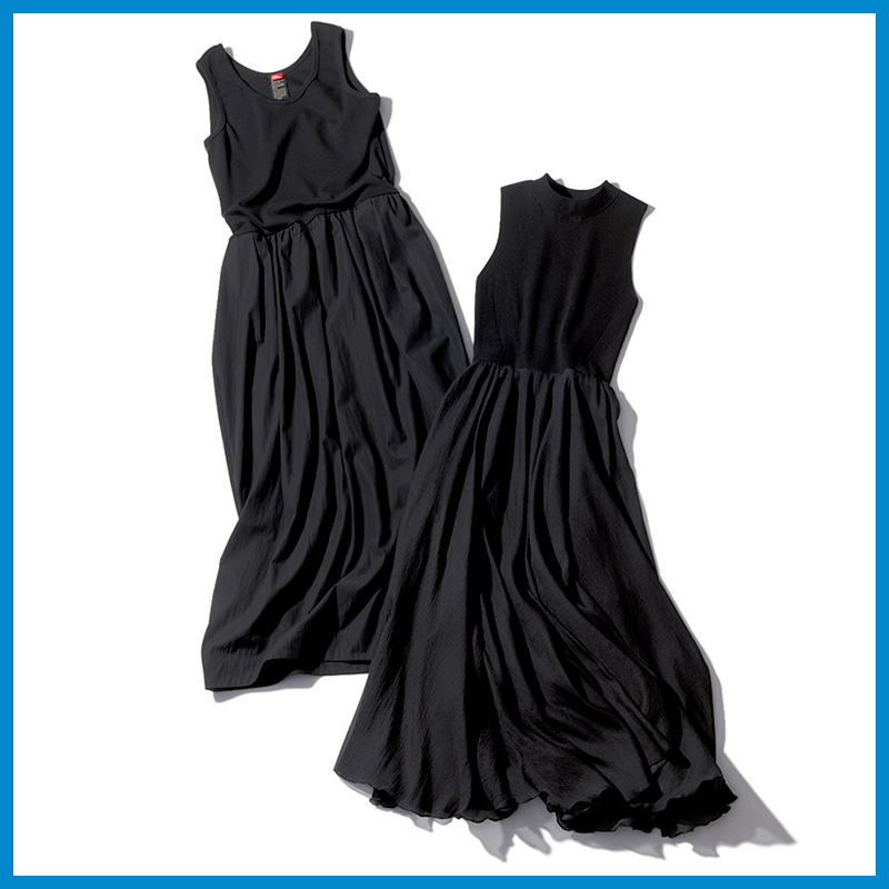 裾にゴムが入った長いワンピースをウエストや胸元まで内側に折り返すことで、長さやシルエットのアレンジも自在。シャリッとした透け感のある素材とバルーンな裾がミニマルさに+αな風合いを添えるスタイリッシュなデザインです。ワンピース¥26,400(セピエ/コラージュ ガリャルダガランテ 京王百貨店新宿店)
