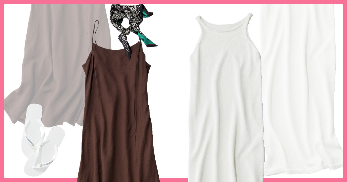 ストラップワンピは小物使いで抜け感を楽しむのがおすすめ。ヘルシーな肌見せを叶えてくれるキャミソールデザイン。デイリー使いしやすい開きすぎないデコルテや、ラインを美しく見せてくれる生地のバイアス使いなど、シンプルながらこだわり満載。普段使いから旅先まで、シーンレスで活躍してくれそう! ワンピース¥26,400(カデュネ)スカーフ¥16,500(マニプリ)サンダル¥4,400(ハワイアナス)
