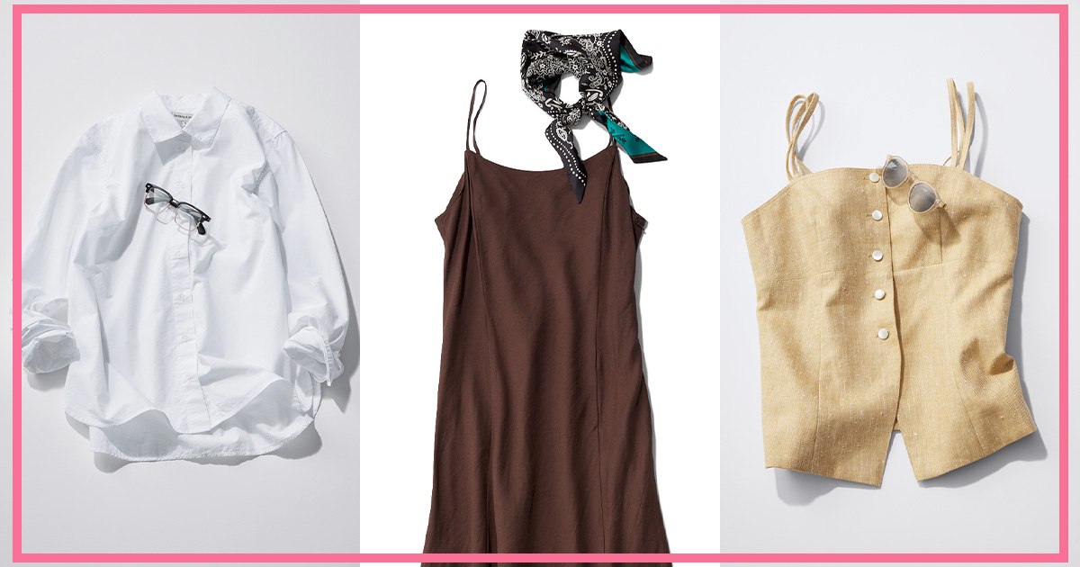 ヘルシーな肌見せを叶えてくれるキャミソールデザイン。デイリー使いしやすい開きすぎないデコルテや、ラインを美しく見せてくれる生地のバイアス使いなど、シンプルながらこだわり満載。普段使いから旅先まで、シーンレスで活躍してくれそう! ワンピース¥26,400(カデュネ)スカーフ¥16,500(マニプリ)サンダル¥4,400(ハワイアナス)