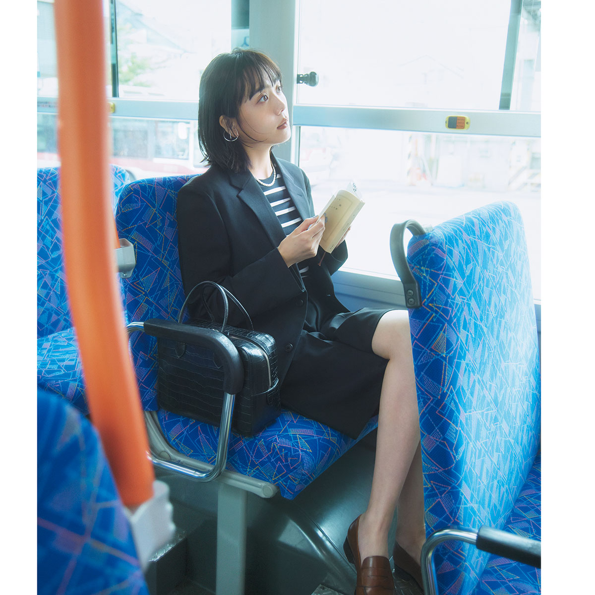 オフィス内でも外回りでもきちんと感をキープしたいときに活躍するのが、黒を主役にしたジャケットスタイル。ショートパンツで抜けを作れば、堅くなりすぎずハンサムに決まります。ボーダーを効かせることで、モノトーンでも軽快かつこなれた雰囲気に。