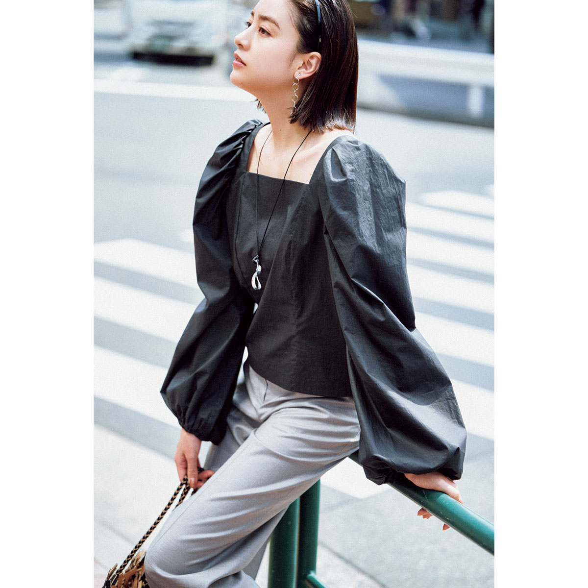 大きく膨らむパフスリーブが目を引くブラウスは、デコルテをすっきり見せるスクエアネックとハリ素材で大人らしく仕上げるのが正解。シックな黒を選ぶことで、可愛げがありながらもモードな印象に。シンプルなグレーパンツを合わせれば、盛り袖の存在感を引き立てつつ、初対面のシーンにも好印象な洗練コーデが完成します。