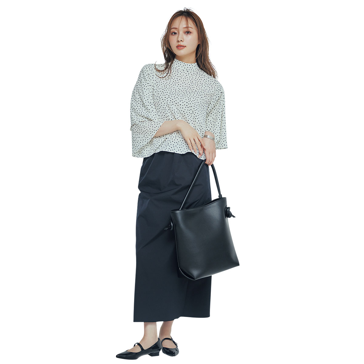 子供見えが気になるドット柄ブラウスは、小さめドット&モノトーン配色なら大人も取り入れやすい一枚。ハイネックデザインがクラシカルなムードを添え、可愛さをほどよくセーブしてくれます。Iラインスカートでメリハリを出せば、スタイルアップ効果も。ブラウスの良さが引き立つよう、小物は黒でまとめるのも手。