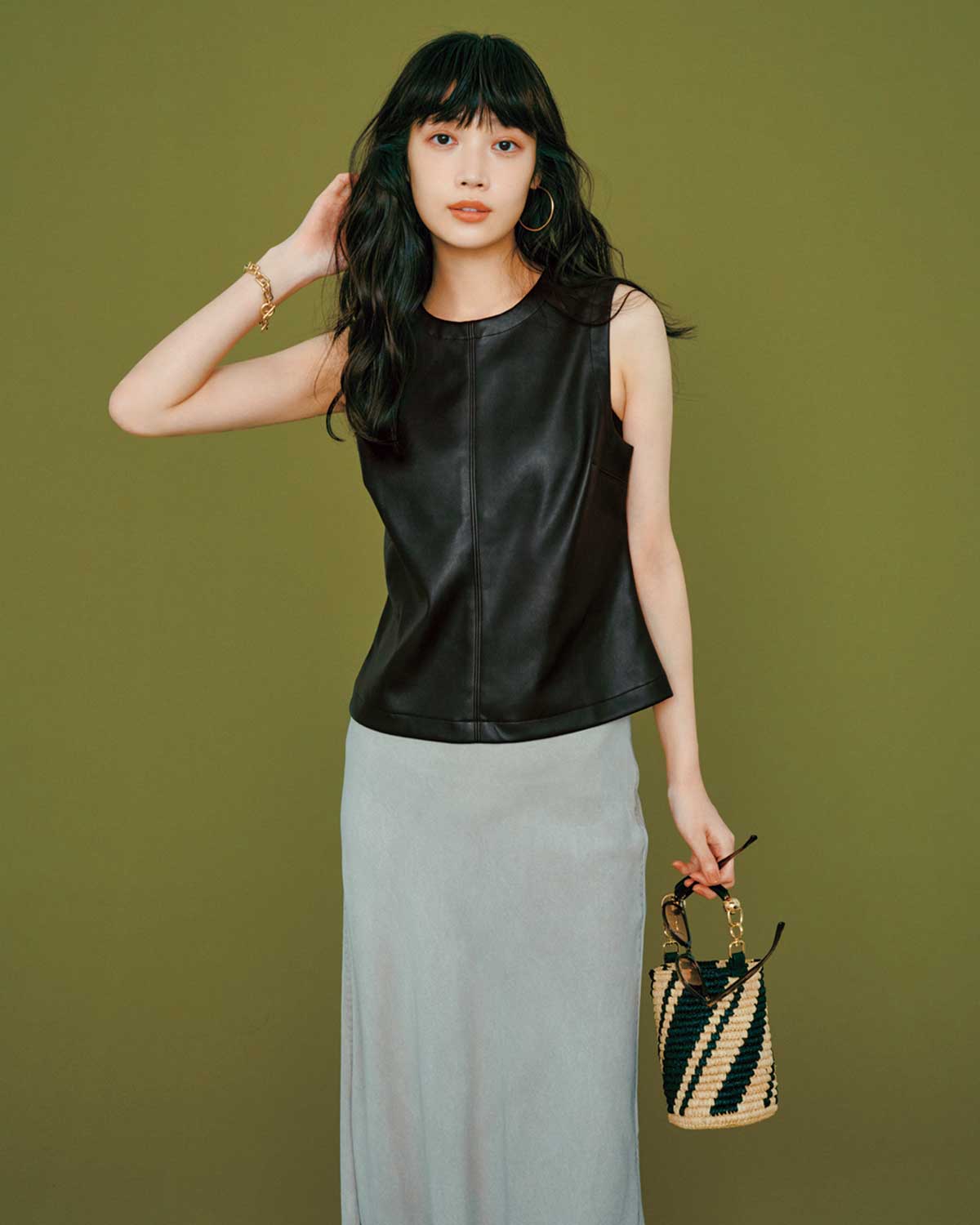 まだ汗ばむ日中のお出かけは、ノースリで暑さ対策をしつつ、エコレザーで秋ムードをプラス。落ち感のあるスカートを選ぶことで、快適さを保ちながら大人らしくまとまります。シックな配色が沈まないよう、ゴールドのアクセで華やぎを添えるのがカギ。