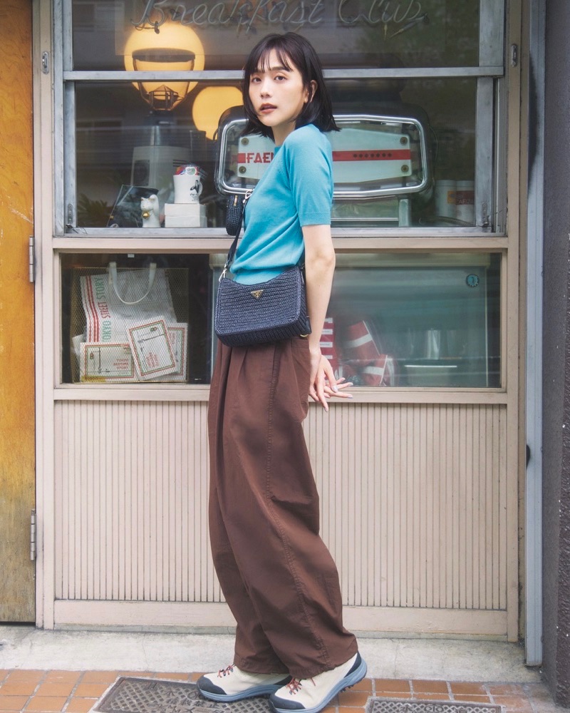 9月15日(月)、こっくりとしたブラウンのワイドパンツは、ゆるめシルエットでリラクシー。ボーイッシュになりすぎないように、トップスは肌にフィットするコンパクトなニットを選んで女性らしさをキープして。鮮やかなブルーは、実は黒よりもブラウンパンツと好相性で、秋の始まりを感じさせるカラーリングに。足元はボリューミーなスニーカーでバランスを取りつつ、軽快さをプラスした大人の残暑コーデ。